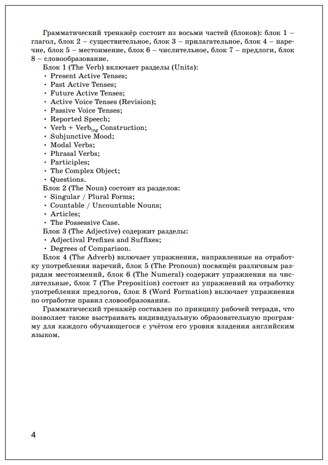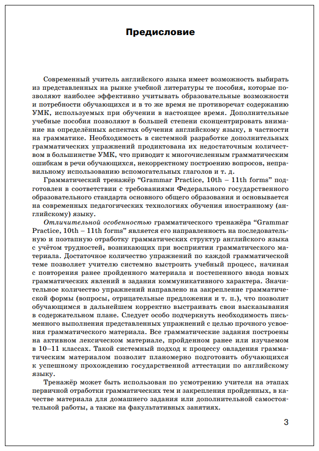 Грамматический тренажёр предназначен для активной отработки грамматических тем, представленных в большинстве современных УМК по английскому языку, рекомендованных Министерством образования и науки РФ для общеобразовательной школы. Грамматические темы, включённые в тренажёр, составляют основу формирования иноязычной коммуникативной компетенции обучающихся 10-11 классов. Технологии выполнения заданий тренажёра способствуют успешной подготовке обучающихся к прохождению государственной аттестации по английскому языку.