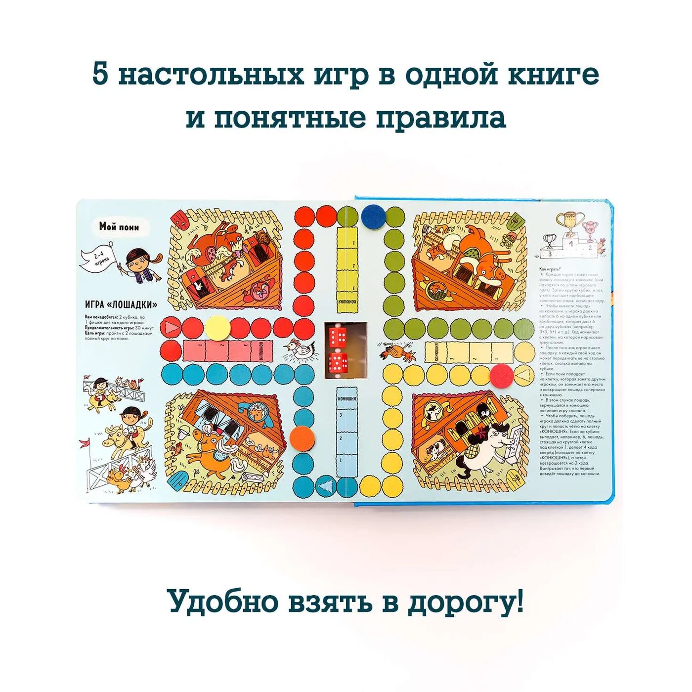 Очень крутая книга!!!Мы большие любители настолок!Поэтому решила купить вот такую книгу.подарок на новый год,и дома поиграть и с собой удобно взять,в машине,фишки не сползают.кубики встроенные,ну круто же!И на дачу целых 5 игр вот вам пожалуйста,и к друзьям в гости.Плотный картон,все яркое,смешные иллюстрации,игры не сложные,уверенна дочке понравится,будем играть новогодние каникулы)