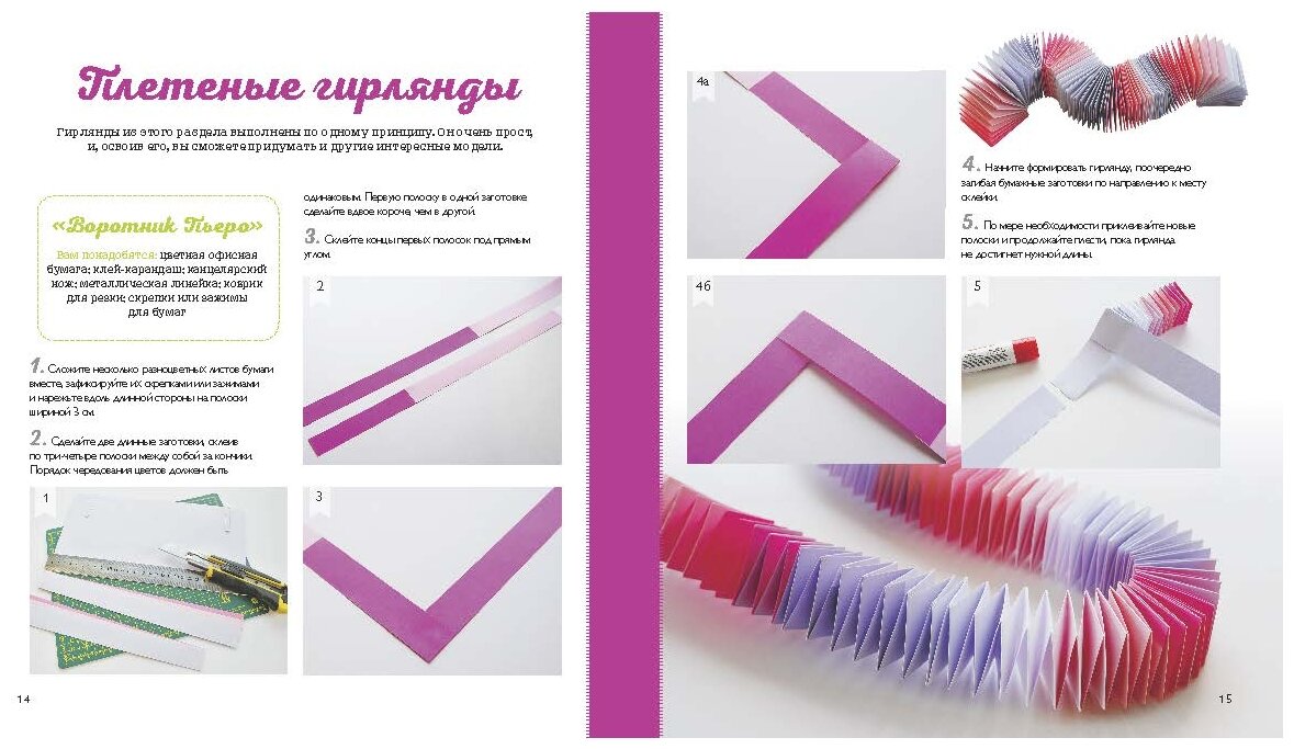 Мне понравилось, что идеи и способы изготовления описаны пошагово, сопровождаются понятными четкими фотографиями. Получилось более 30 видов гирлянд из бумаги от самых простых до более сложных в изготовлении - пикадо. Можно выбрать на свой вкус, способности и имеющееся время.