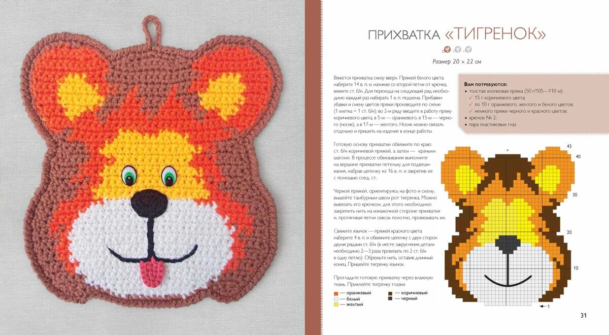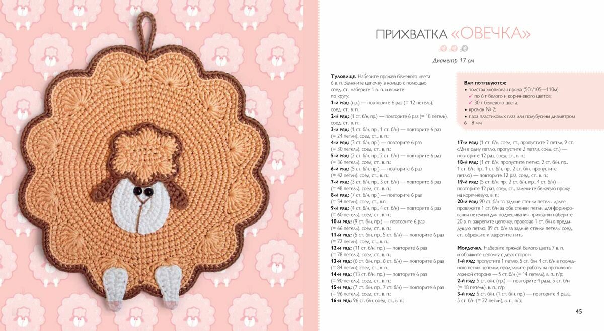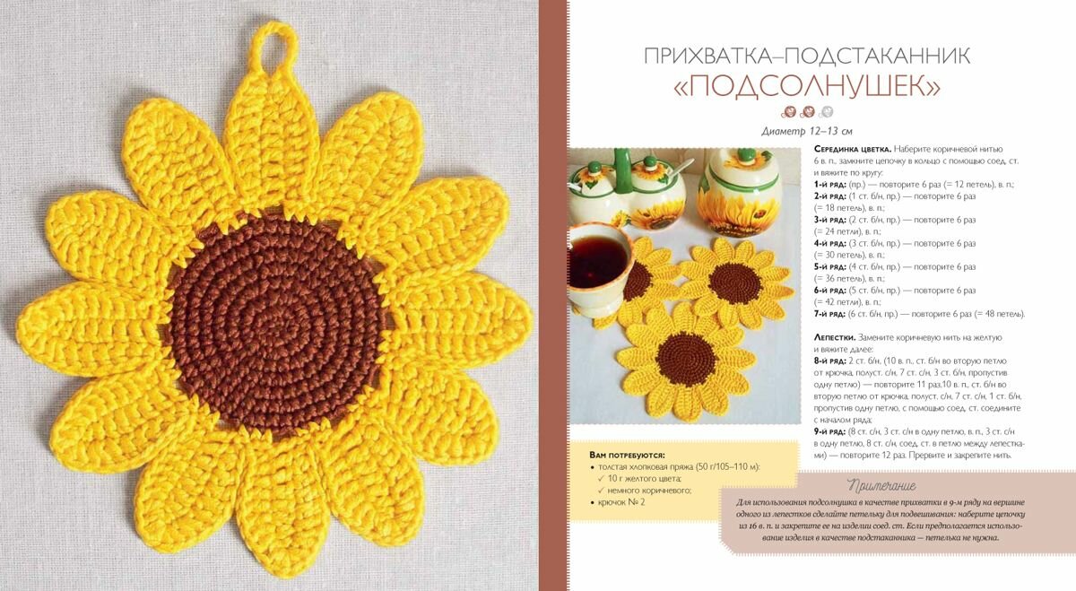 Содержательная книга. Красочные картинки, подробная инструкция и цветные схемы, понятные даже для ребенка. Вязать лучше из толстого качественного хлопка. С обратной стороны можно подшить плотную ткань. Получаются красивые и оригинальные кухонные аксессуары для декора и на подарок. А можно просто использовать в качестве подставок-салфеточек в детской комнате.