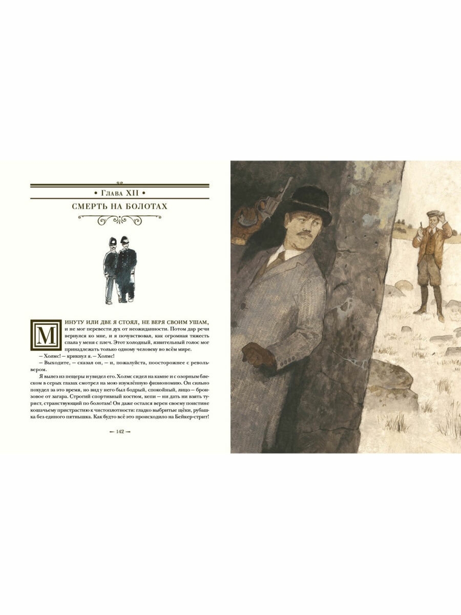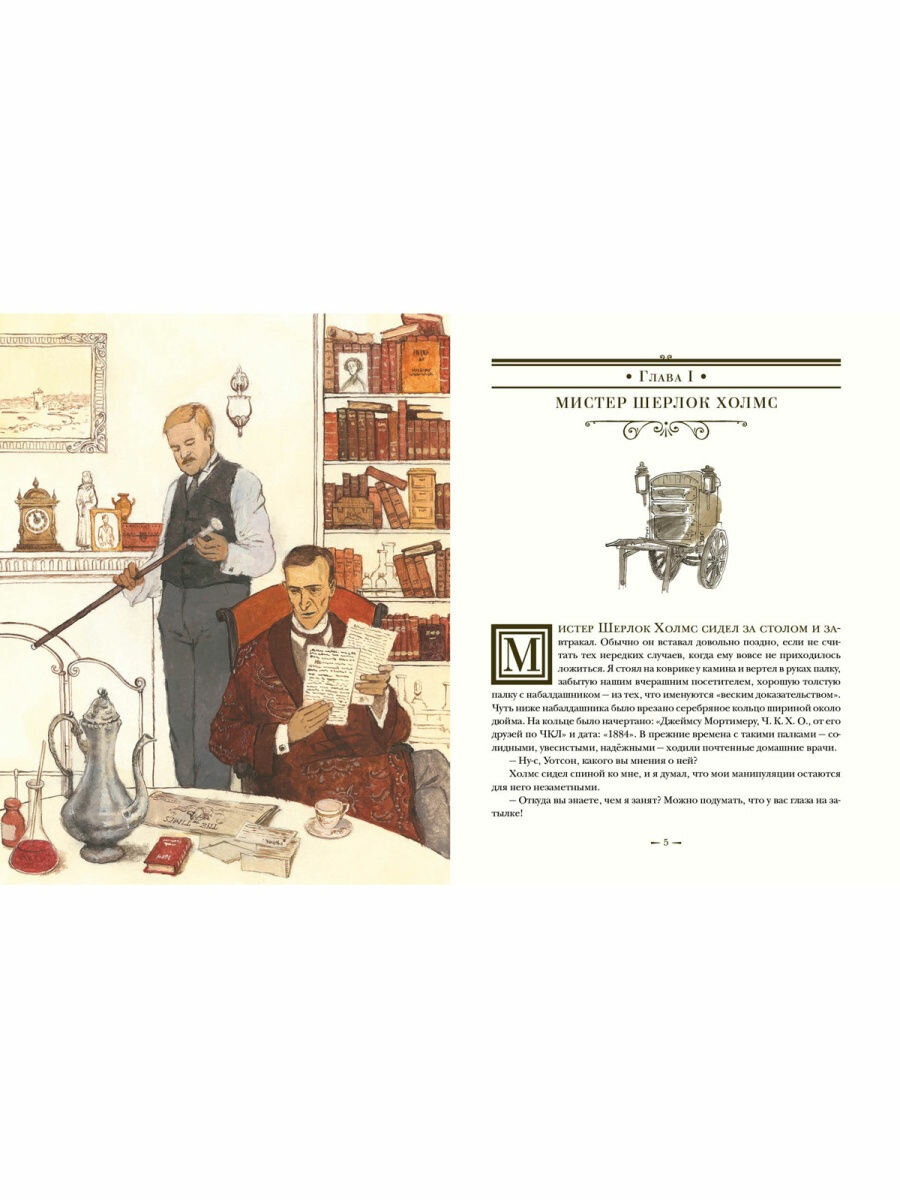 Сюжет пересказывать нет смысла, его знают все с детства, даже те, кто не читал, но смотрел экранизацию, в которой великолепные Василий Ливанов и Виталий Соломин воплотили образы великого сыщика и его помощника. Признаюсь откровенно, польстилась ещё и потому, что сыщики на рисунках напомнили о старом советском фильме. Прочитали вдвоём с сыном и сразу же пересмотрели с огромным удовольствием.