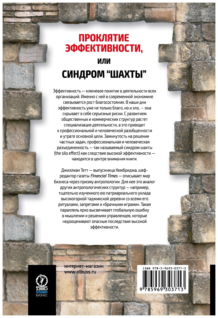 Шеф-редактор газеты Financial Times Джиллиан Тетт в предлагаемой читателям книге определяет синдром "шахты" более широко - как "любое строгое разделение функций, полномочий и представлений", в том числе взглядов и установок. Отвечая на вопрос, неизбежно ли возникает эта проблема при развитии организации, автор книги переводит анализ в русло социальной и культурной антропологии и предлагает нетривиальные бизнес-решения.
