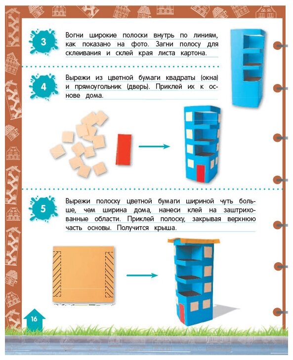 Книга интересная, красочная, яркая. На мой взгляд оригинальная задумка с поделками на определенную тему, а в результате появляется большой проект - ребенку предлагается, например, сделать целый город и дается подробное иллюстрированное описание того, как сделать отдельные элементы - дома, транспорт, дорожные знаки и пр.