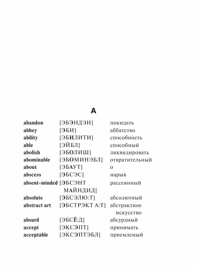 Словарь карманного формата, предназначен для начинающих изучать английский язык. От других словарей отличается тем, что здесь дана не транскрипция, а простая транслитерация русскими буквами, например, ДИП, ДИПЛИ и т.п. При этом ударение выделено жирным шрифтом. Так обычно сопровождается произношение в разговорниках. Но структурирована книга именно как словарь, поэтому словарем по праву и называется. Пригодится также в загранпоездках.