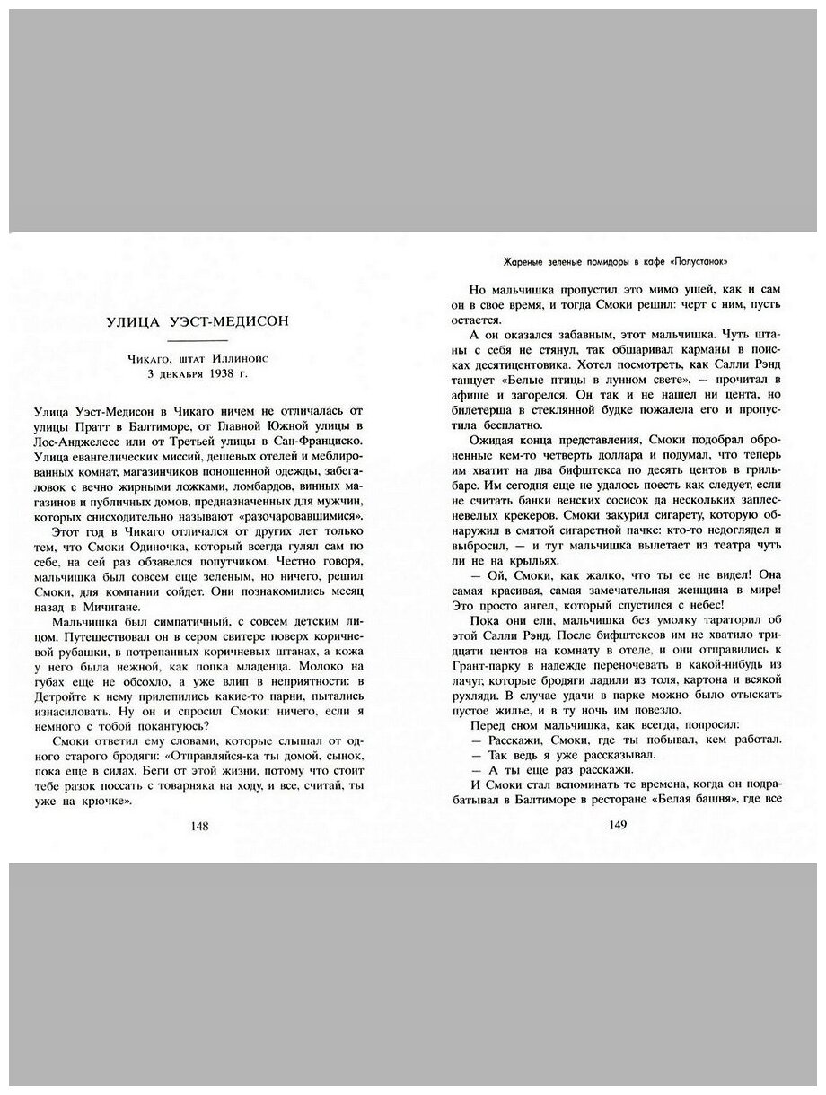 Итак эта книга об усах, похожих, на велосипедный руль, о коробке с пальцем, о еноте, который тщетно пытался постирать безе и мороженое, о деревянном петушке на нитке, о карточных костюмах, о курице Сестрёнке, которая умерла от старости, о карих глазах с длинными ресницами и о глазах цвета зелёных яблок, о дупле пчёл и кувшине мёда, о том, как люди могут быть просто созданы друг для друга, сидеть рядышком на крыльце и хихикать всю ночь напролет, о "— Тогда останься", и о "— Не могу", о подушке, сырой от слёз, об ореховом пироге, о стареньком "Додже", о сосисках с булочкой за 5 центов, о том, что никто в целом свете не был ближе, чем эти двое, об озорной птичке, о том как плакал орган и, конечно же, о жареных зелёных помидорах - блюде, которого нет вкуснее на свете. -