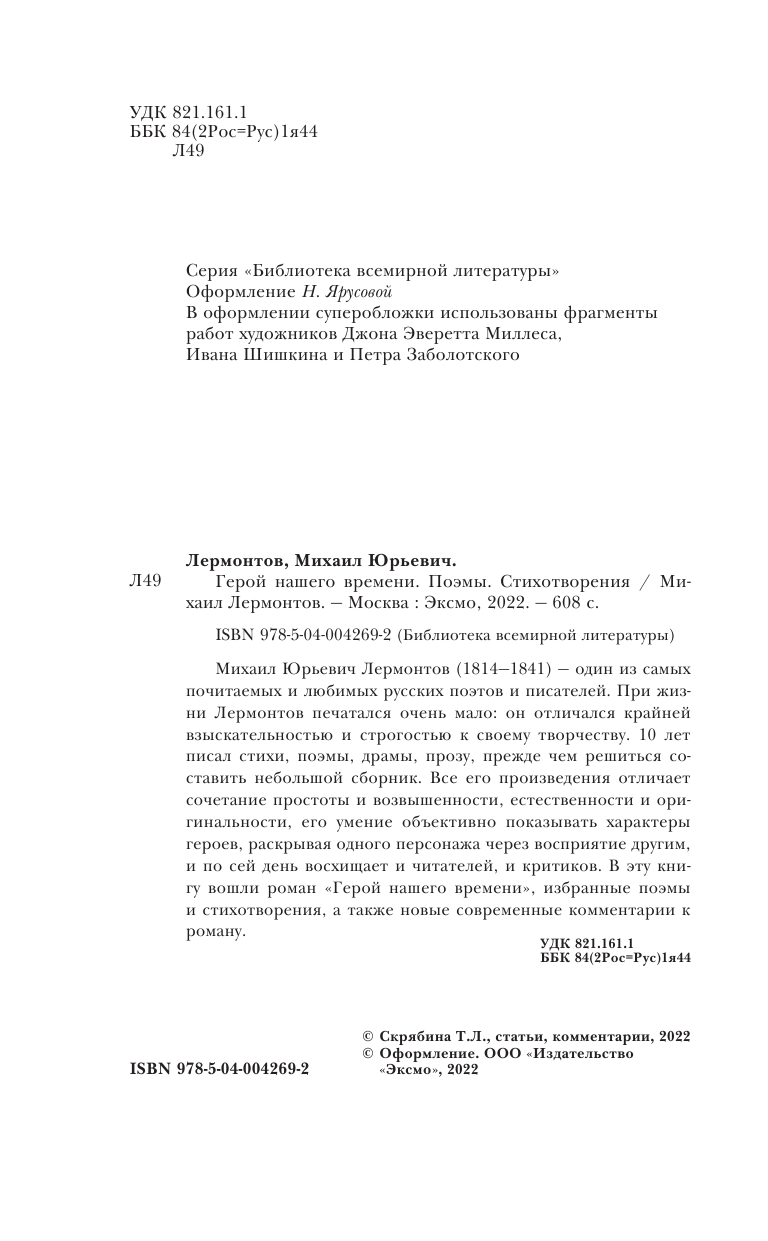 Михаил Юрьевич Лермонтов (1814 - 1841) - один из самых почитаемых и любимых русских поэтов и писателей. При жизни Лермонтов печатался очень мало: он отличался крайней взыскательностью и строгостью к своему творчеству. 10 лет писал стихи, поэмы, драмы, прозу, прежде чем решиться составить небольшой сборник. Все его произведения отличает сочетание простоты и возвышенности, естественности и оригинальности, его умение объективно показывать характеры героев, раскрывая одного персонажа через восприятие другим, и по сей день восхищает и читателей и критиков. В эту книгу вошли роман "Герой нашего времени", избранные поэмы и стихотворения, а также новые современные комментарии к роману.