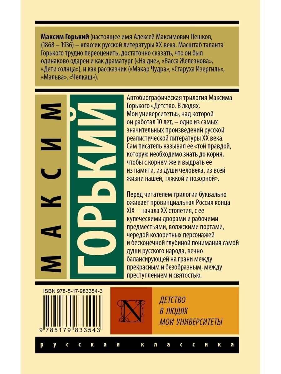 Автобиографическая трилогия Максима Горького "Детство. В людях. Мои университеты", над которой он работал 10 лет - одно из самых значительных произведений русской реалистической литературы ХХ века. Сам писатель называл ее "той правдой, которую необходимо знать до корня, чтобы с корнем же и выдрать ее из памяти, из души человека, из всей жизни нашей, тяжкой и позорной".