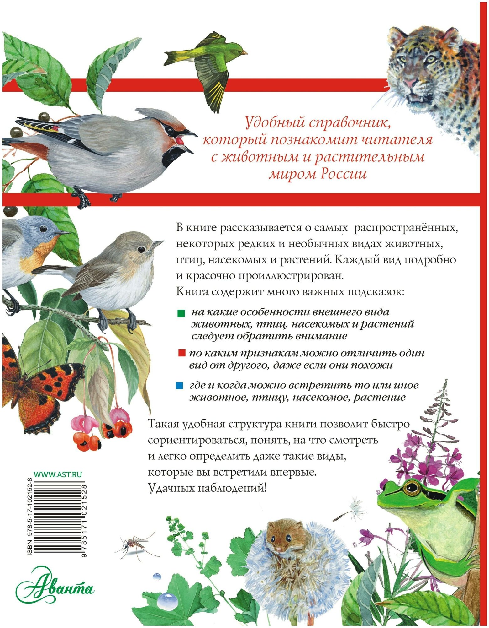 Большой определитель зверей, амфибий, рептилий, птиц, насекомых и растений России» должен быть в каждом доме, где живёт хоть один человек, неравнодушный к родной природе. Он нужен всем, кто хочет узнать зверя, птицу или растение, встреченное в парке, на улицах города, в лесу, на берегу реки или в любом другом месте. Книга пригодится даже мамам и папам, дедушкам и бабушкам самых маленьких детей, чтобы ответить ребёнку на вопрос, как называется увиденное им растение. Удобная структура книги позволит быстро сориентироваться, понять, на что смотреть и легко определить даже такие виды, которые вы встретили впервые.