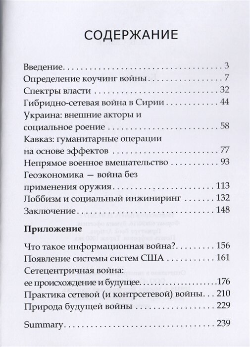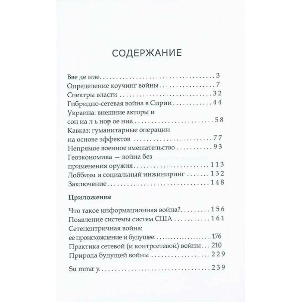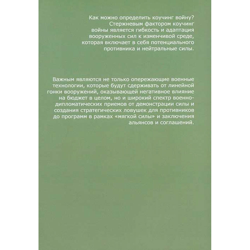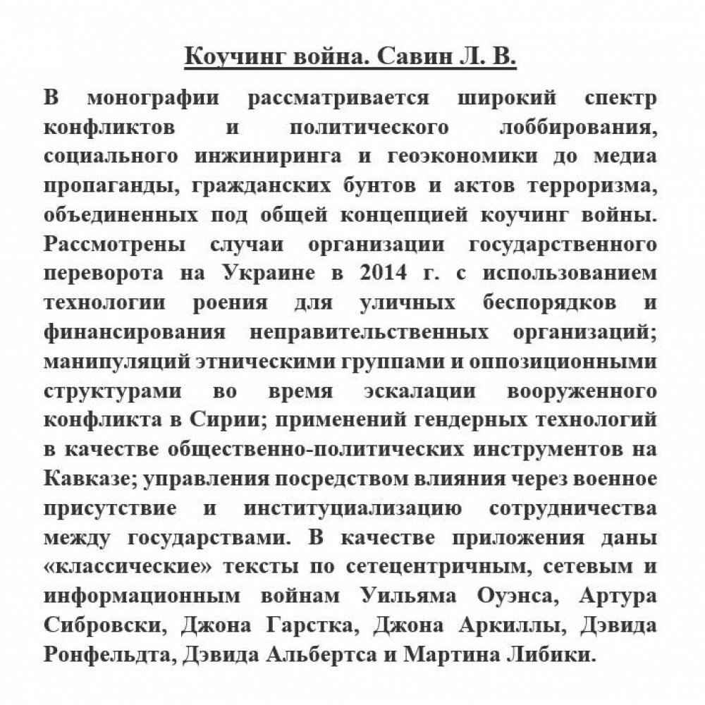 В монографии рассматривается широкий спектр конфликтов и политического лоббирования, социального инжиниринга и геоэкономики до медиа пропаганды, гражданских бунтов и актов терроризма, объединенных под общей концепцией коучинг войны. Рассмотрены случаи организации государственного переворота на Украине в 2014 г. с использованием технологии роения для уличных беспорядков и финансирования неправительственных организаций; манипуляций этническими группами и оппозиционными структурами во время эскалации вооруженного конфликта в Сирии; применений гендерных технологий в качестве общественно-политических инструментов на Кавказе; управления посредством влияния через военное присутствие и институциализацию сотрудничества между государствами.