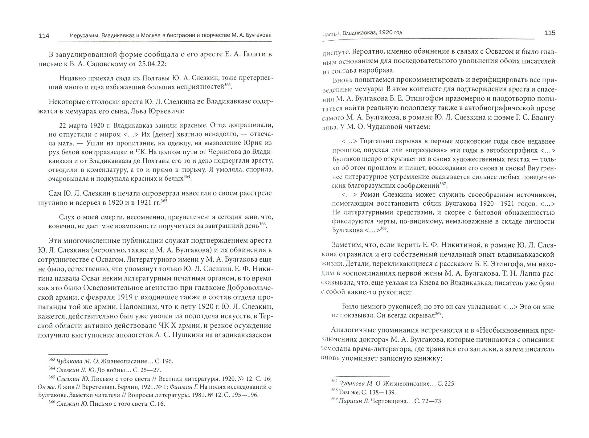 Монография О. Е. Этингоф "Иерусалим, Владикавказ и Москва в биографии и творчестве М. А. Булгакова" затрагивает события жизни писателя и то, как они отразились в его произведениях. На основе многочисленных не публиковавшихся ранее архивных документов, забытых публикаций в прессе и мемуаров собран обширный источниковедческий материал, касающийся времен Гражданской войны на Северном Кавказе и московского периода 1930-х годов.