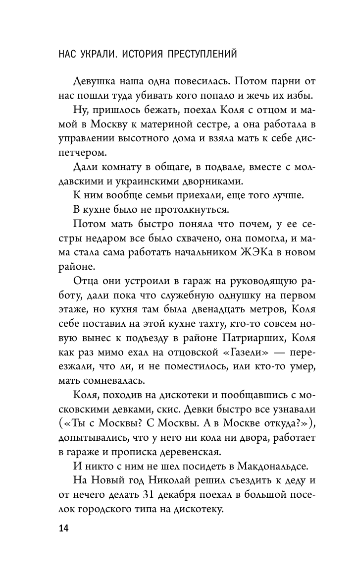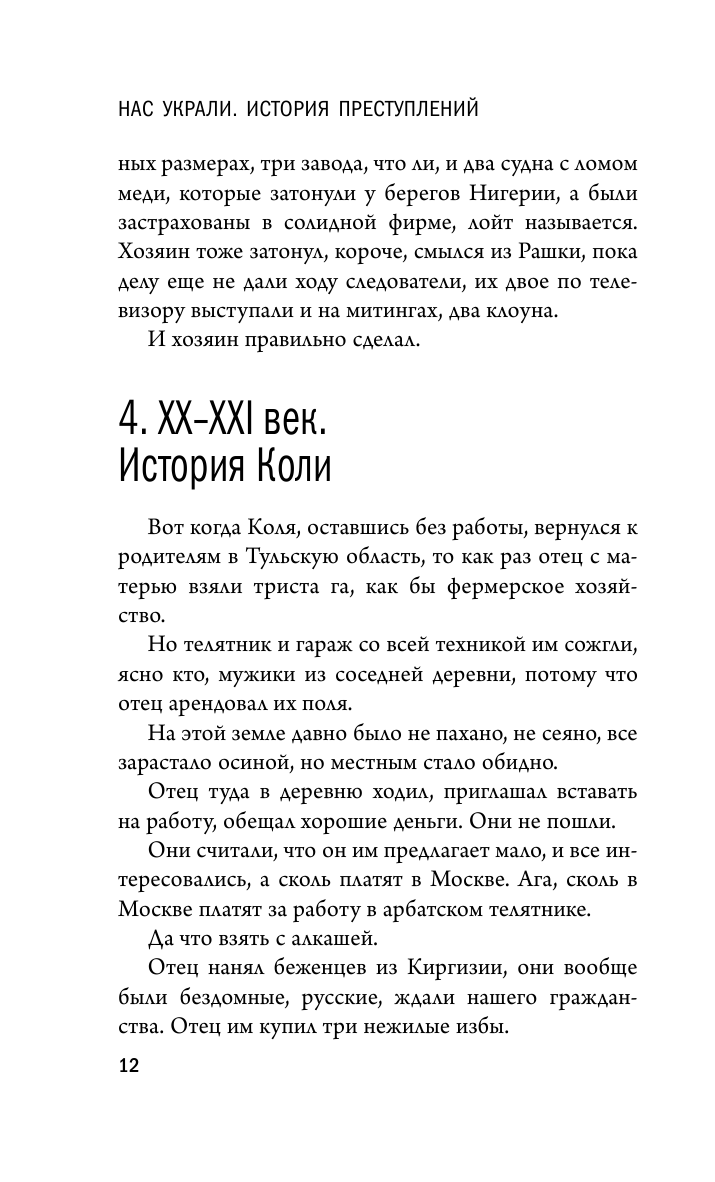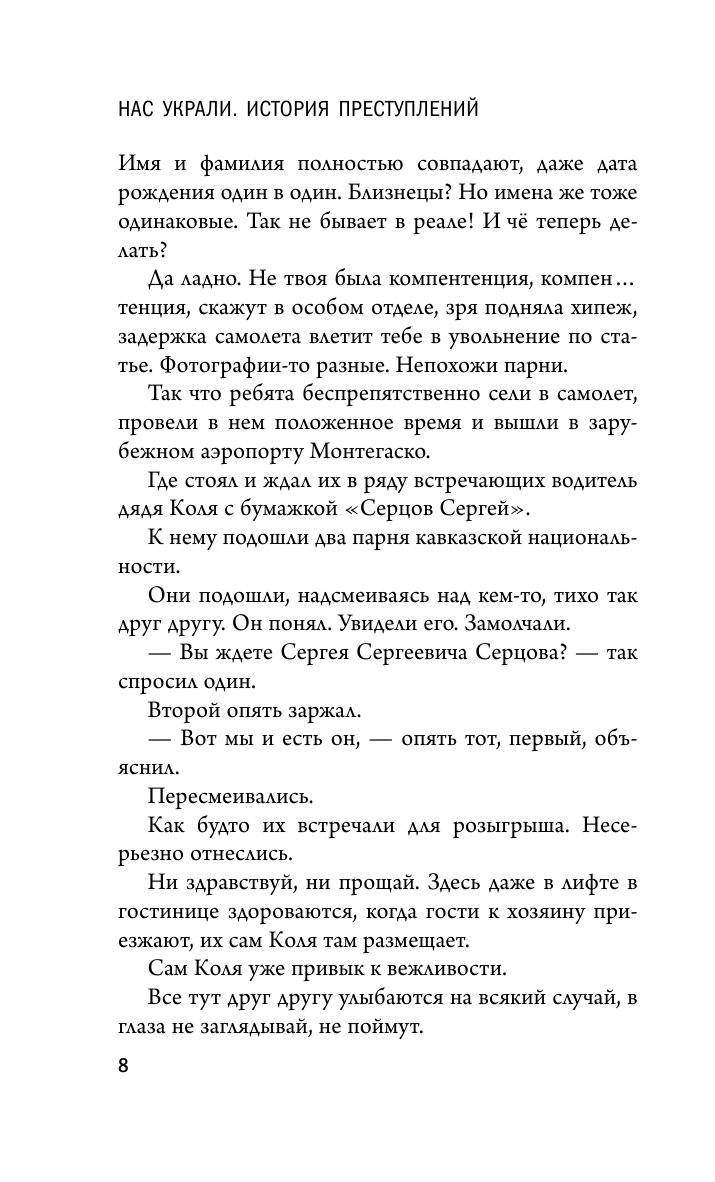 Роман "Нас украли. История преступлений" - это детектив нового поколения. В нем не действуют честные, умные следователи, класс, практически исчезнувший у нас. Это та история, в которой жертвы не хотят расследования, и тому есть причина. А вот что это за причина, читатели сами поймут к концу романа: ведь в каждом из нас сидит следователь, благородный, умный, не берущий взяток, стремящийся к истине и понимающий, что на свете есть такая странная вещь, как любовь.