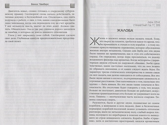 Любителям экшена, драйва, звездных войн и космических баталий, скорее всего, стоит пропустить эту книгу. Тем же, кто хочет просто получить удовольствие от хорошей неспешной книги – рекомендую однозначно! Повествование ведется размерено, как и полет старого коммерческого корабля. Много героев, много разных рас, каждая из которых тщательно описана. Диалоги, иногда несущие смысл, иногда же просто - трёп друзей. Шутки, смешные и колкие. Размышления людей и нелюдей на вечные темы добра и зла, хорошего и плохого, войне и мире, семье и одиночестве. Книга, как передача Михаила Кожухова «Клуб Путешественников», рассказывает нам об удивительном мире вокруг нас и его обитателях. -