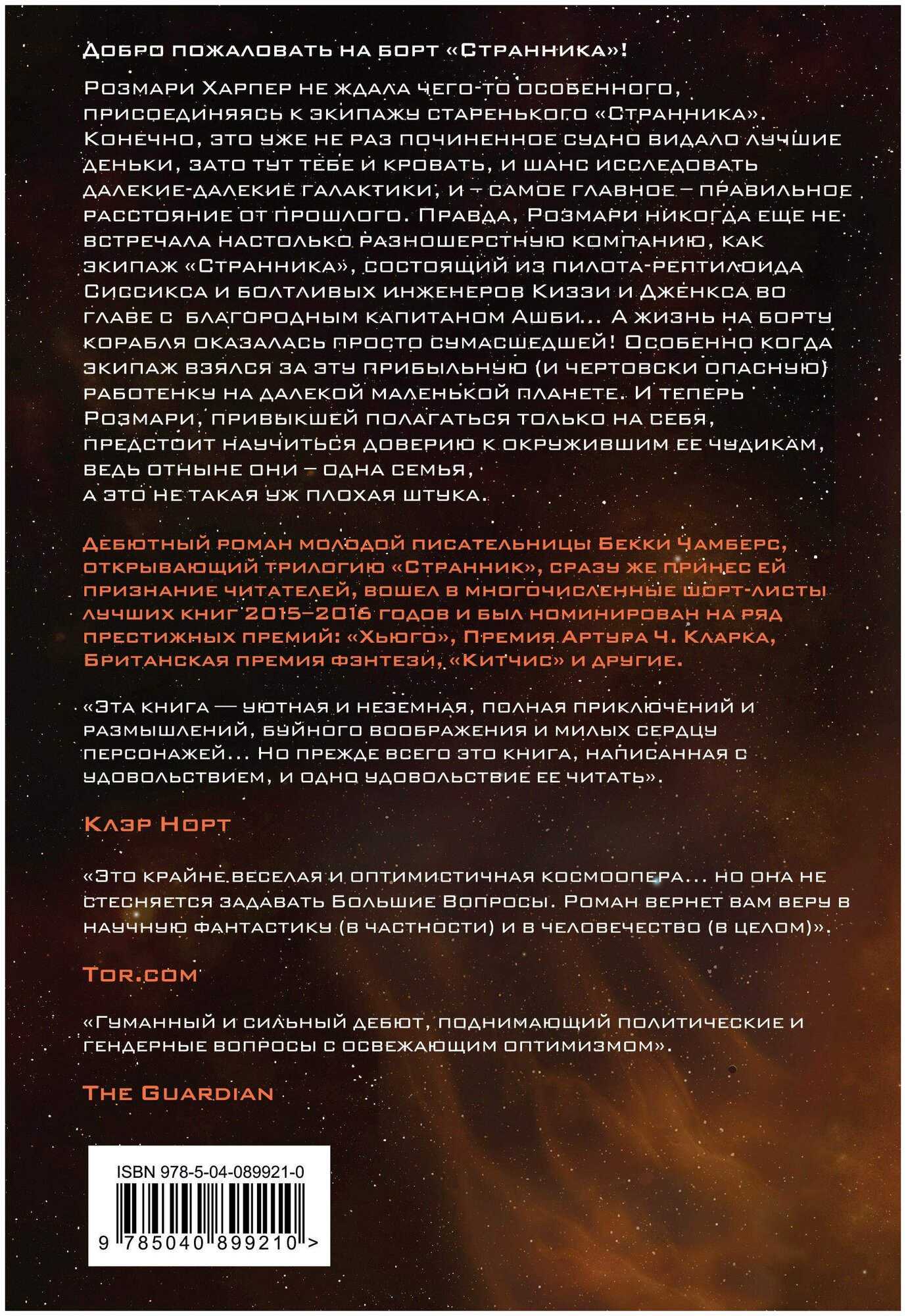 Добро пожаловать на борт "Странника"!Розмари Харпер не ждала чего-то особенного, присоединяясь к экипажу старенького "Странника". Конечно, это уже не раз починенное судно видало лучшие деньки, зато тут тебе и кровать, и шанс исследовать далекие-далекие галактики, и – самое главное – правильное расстояние от прошлого. Правда, Розмари никогда еще не встречала настолько разношерстную компанию, как экипаж "Странника", состоящий из пилота-рептилоида Сиссикса и болтливых инженеров Киззи и Дженкса во главе с благородным капитаном Эшби… А жизнь на борту корабля оказалась просто сумасшедшей! Особенно когда экипаж взялся за эту прибыльную (и чертовски опасную) работенку на далекой маленькой планете. И теперь Розмари, привыкшей полагаться только на себя, предстоит научиться доверию к окружившим ее чудикам, ведь отныне они – одна семья, а это не такая уж плохая штука.