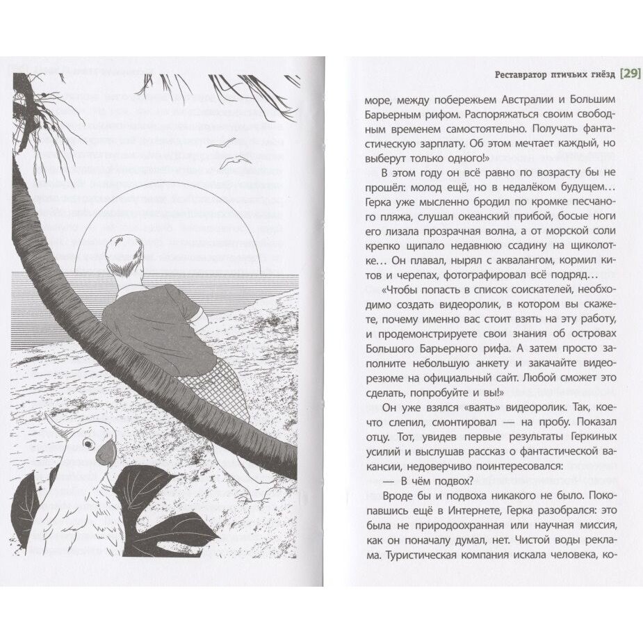 Книга "Реставратор птичьих гнезд" отпечатана на белой бумага с небольшим количеством чёрно-белых иллюстраций. Написано с использованием современного молодёжного сленга, читается легко. Сюжет жизненный - на первый взгляд, вроде как, в жанре "пропало лето", но развитие показывает, что не только. Характеры героев и их поступки понятны и правдивы. Одним словом можно сказать: "верю". Однозначно, книгу будет полезно прочитать взрослеющему человеку.