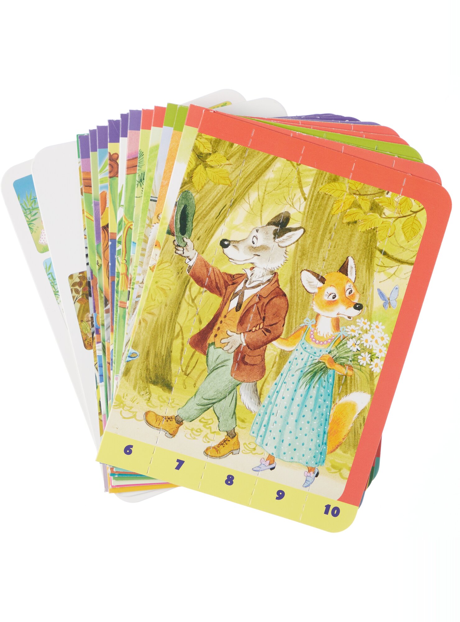 В каждой коробочке 20 пазлов-картинок. Каждая картинка имеет цветную рамку и разделяется на десять пронумерованных полосок. Малыш собирает полоски по цвету и цифрам и получается картинка!