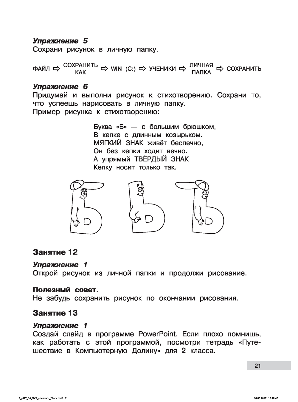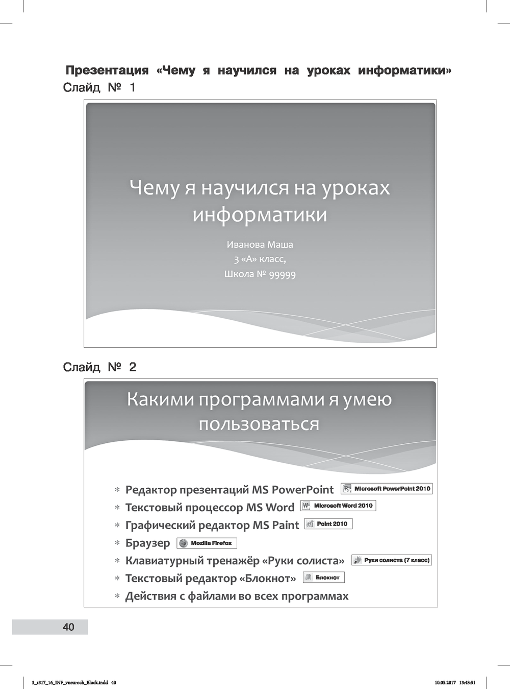 .Содержанием внеурочных занятий в третьем классе являются: поиск информации в глобальной сети Интернет и фиксирование её в электронных документах, создание документов в текстовом редакторе, создание мультимедийных презентаций, коллективная проектная деятельность.