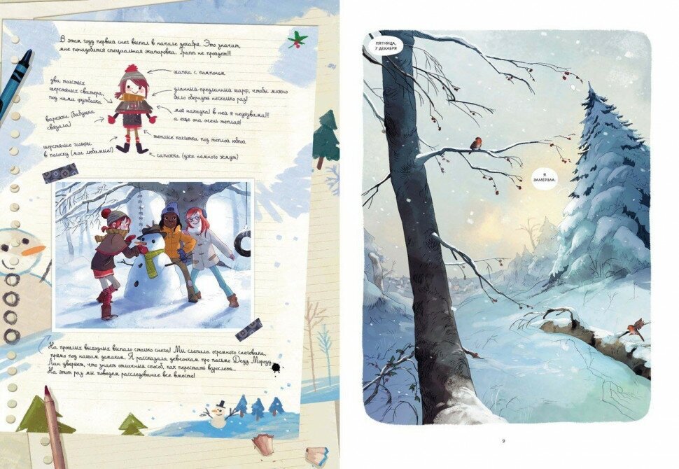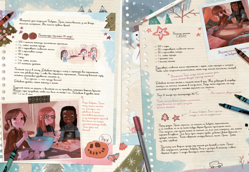 Добавим к этому письмо Деду Морозу, зимние игры, какао, рецепты печенья (которые непременно нужно опробовать), снежные пейзажи, уютные семейные вечера и друзей – вот атмосфера комикса.