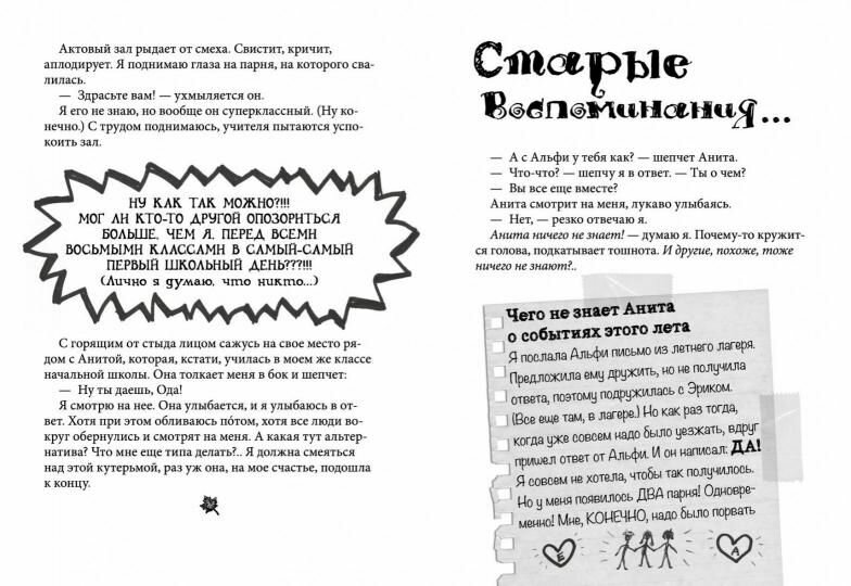 Учителя - куда строже любимого Каллестада. Одноклассницы - думают, что они взрослые и крутые. Мальчишки, особенно старшие, оценивающе рассматривают. Самое ПРОТИВНОЕ - над Одой все вечно смеются: за дружбу с семиклассницей Хелле, за самодельные приглашения на вечеринку, за то, что на праздник она зовет только девчонок… Но всё вдруг ПЕРЕВОРАЧИВАЕТСЯ, когда у нее появляется парень! Не почти совсем, как было с Альфи и Эриком (даже не спрашивайте!!!), а самый настоящий парень - Ларс, которого вся школа считает крутым! Но нравится ли он ей на самом деле? Жизнь героини похожа на бег по лабиринту: то не знаешь, куда повернуть, то сворачиваешь в тупик, и карты никакой нет, и Google ничего не подскажет. Плюс в этом только один: скучно не бывает, а дни не проходят даром! Или это уже два плюса?