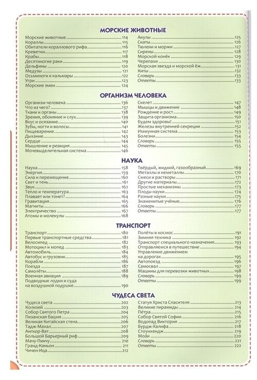 Покупал энциклопедию на подарок своему племяшу, который в этом году идет в первый класс. Мой выбор пал именно на эту книгу, потому что она оформлена просто супер: плотная лакированная обложка, страницы такие гладкие, как будто глянцевые, иллюстраций очень много и все цветные. А что особенно меня порадовало: иллюстрации не просто рисунки, а именно фотографии. Плюс самое оформление классное: каждая большая тема выделена цветом, а на странице отдельные подтемы так же выделены цветным фоном. По содержанию энциклопедия охватывает все основные темы, начиная от Вселенной, заканчивая строением человеческого тела. Понравилось так же, что в энциклопедии раскрыты такие интересные темы, как чудеса света и наука и научные эксперименты. Текст написан просто и понятно. Тем довольно много, поэтому углубленного описания нет, только по существу и самое основное.