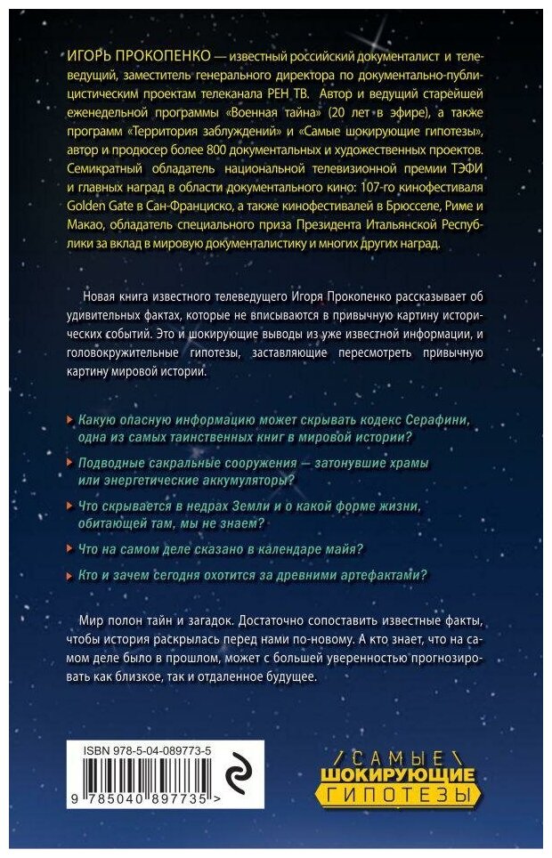 Новая книга известного телеведущего Игоря Прокопенко рассказывает об удивительных фактах, которые не вписываются в привычную картину исторических событий. Это и шокирующие выводы из уже известной информации, и головокружительные гипотезы, заставляющие пересмотреть привычную картину мировой истории. Какую опасную информацию может скрывать кодекс Серафини, одна из самых таинственных книг в мировой истории? Подводные сакральные сооружения – затонувшие храмы или энергетические аккумуляторы? Что скрывается в недрах Земли и о какой форме жизни, обитающей там, мы не знаем? Что на самом деле сказано в календаре майя? Кто и зачем сегодня охотится за древними артефактами? Мир полон тайн и загадок. Достаточно сопоставить известные факты, чтобы история раскрылась перед нами по-новому. А кто знает, что на самом деле было в прошлом, может с большей уверенностью прогнозировать как близкое, так и отдаленное будущее.