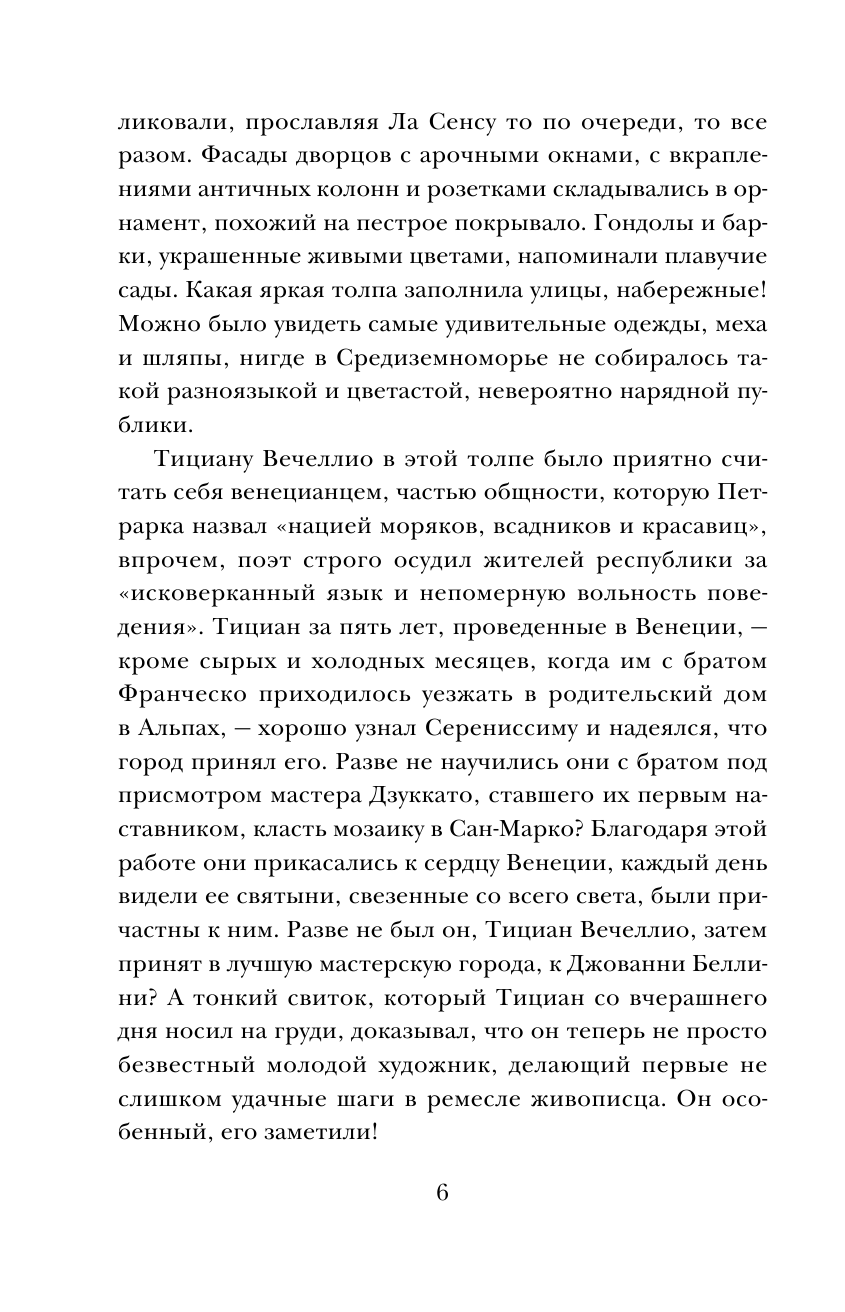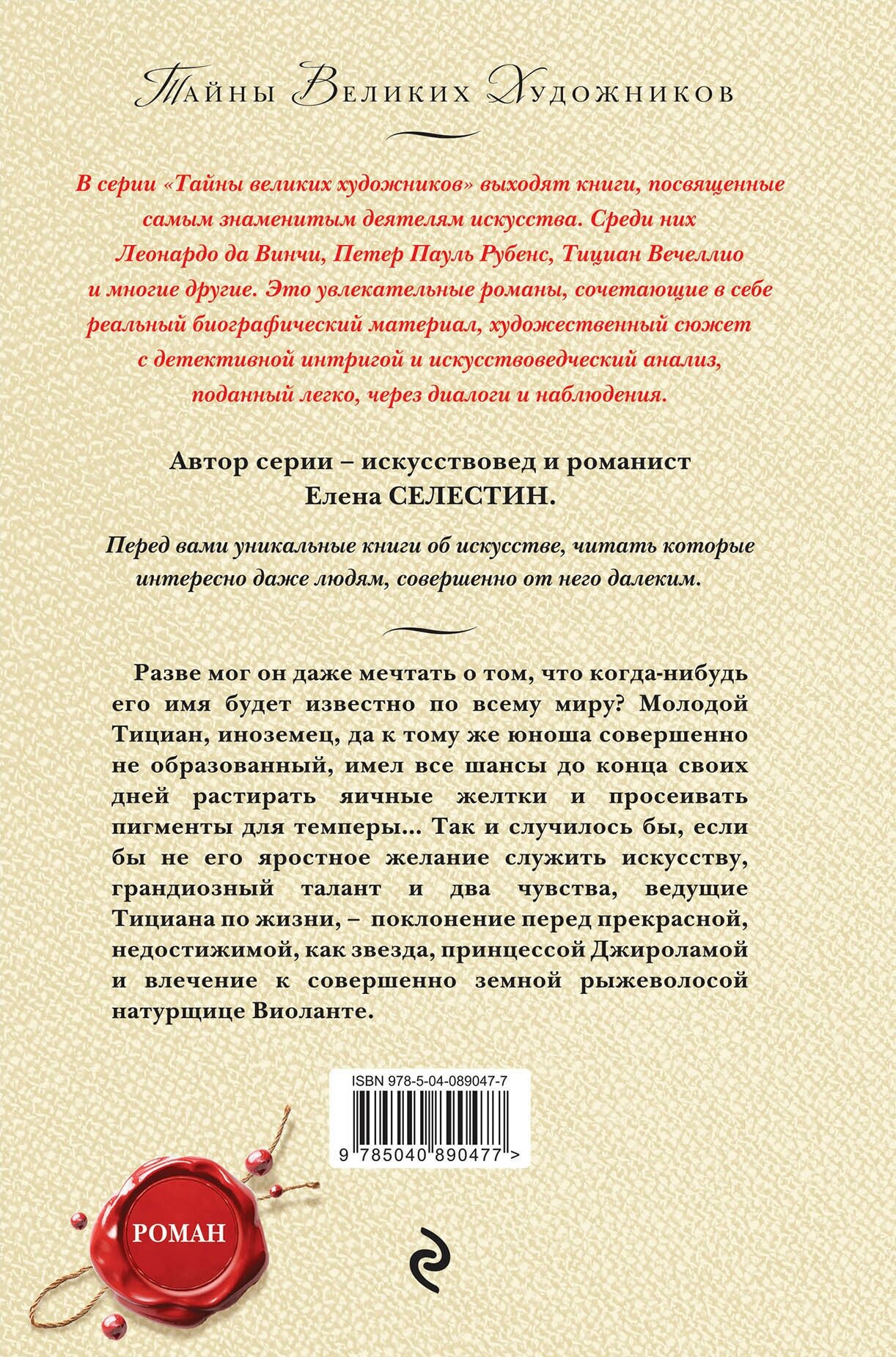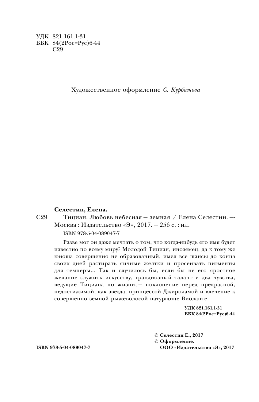 Книга Елены Селестин, искусствоведа и замечательного романиста, "Тициан. Любовь небесная — земная" привлекла меня, прежде всего необычной подачей биографической темы — роман о любви и тайне великого художника. Елена Селестин — автор серии "Тайны великих художников". Книга хорошо оформлена. Бумага офсетная, но качество печати очень хорошее, а шрифт достаточно крупный. В книге периодически встречаются иллюстрации — всего 7 листов мелованной бумаги, на обеих страницах каждого листа — творение великого Тициана.