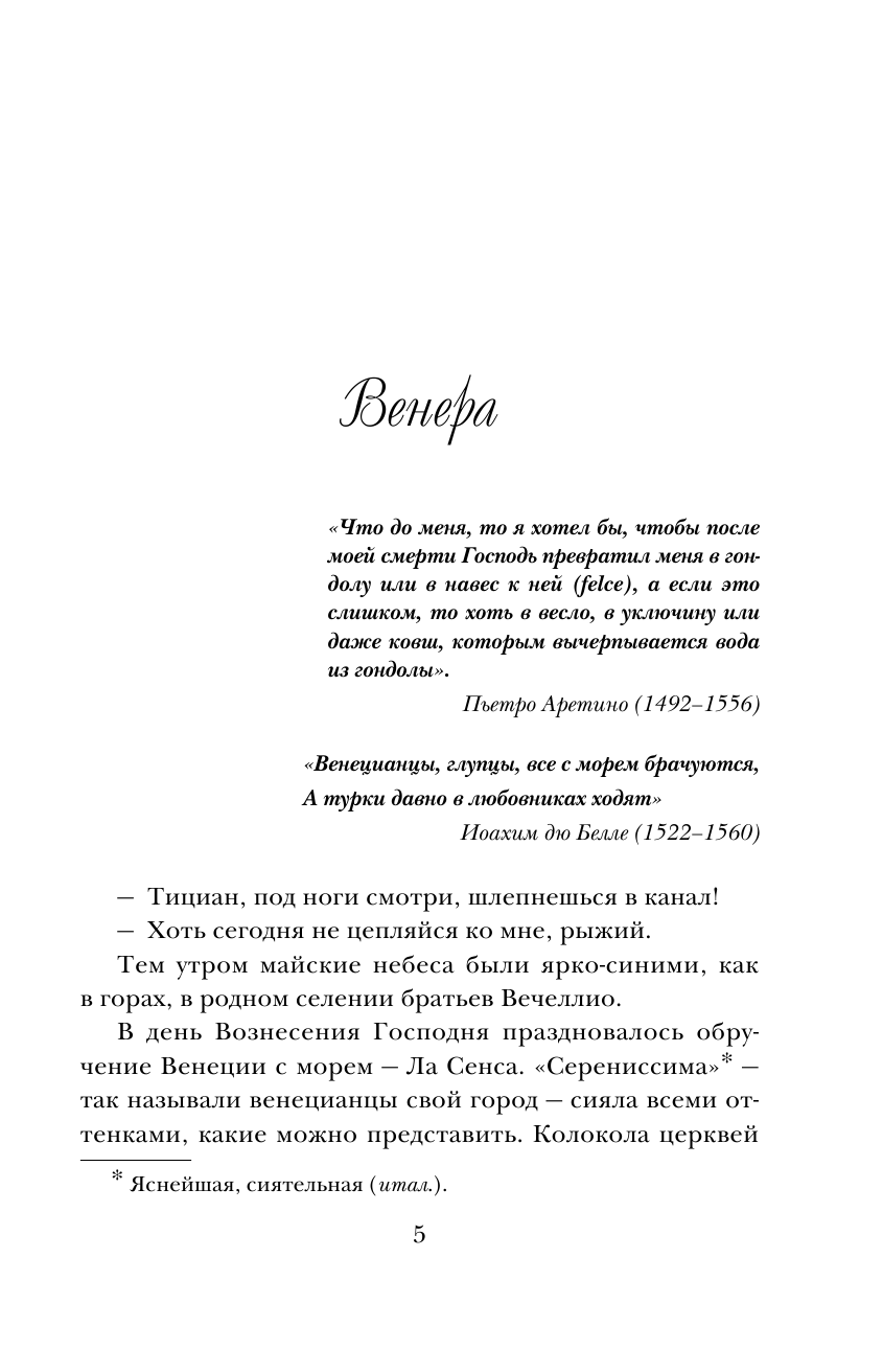 Разве мог он даже мечтать о том, что когда-нибудь его имя будет известно по всему миру? Молодой Тициан, иноземец, да к тому же юноша совершенно не образованный, имел все шансы до конца своих дней растирать яичные желтки и просеивать пигменты для темперы… Так и случилось бы, если бы не его яростное желание служить искусству, грандиозный талант и два чувства, ведущие Тициана по жизни - поклонение перед прекрасной, недостижимой, как звезда, принцессой Джироламой и влечение к совершенно земной рыжеволосой натурщице Виоланте.