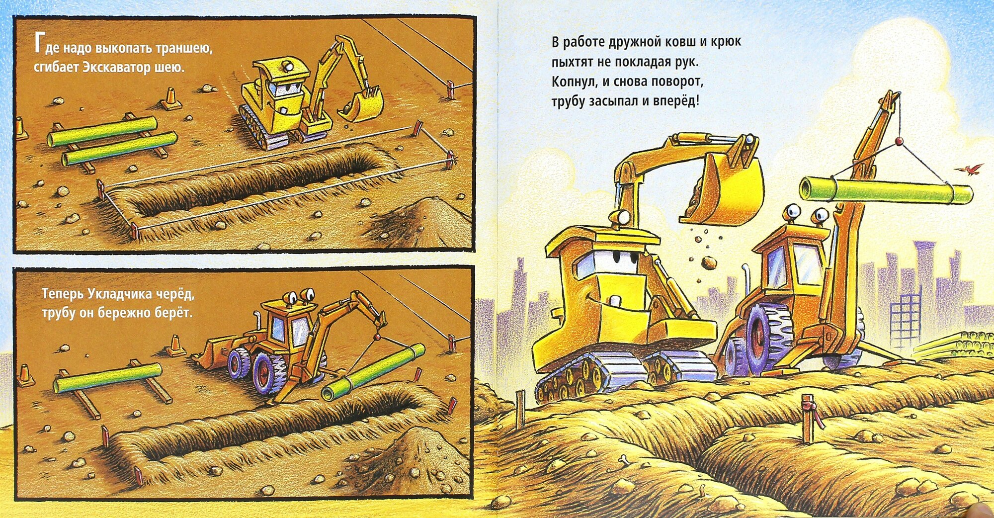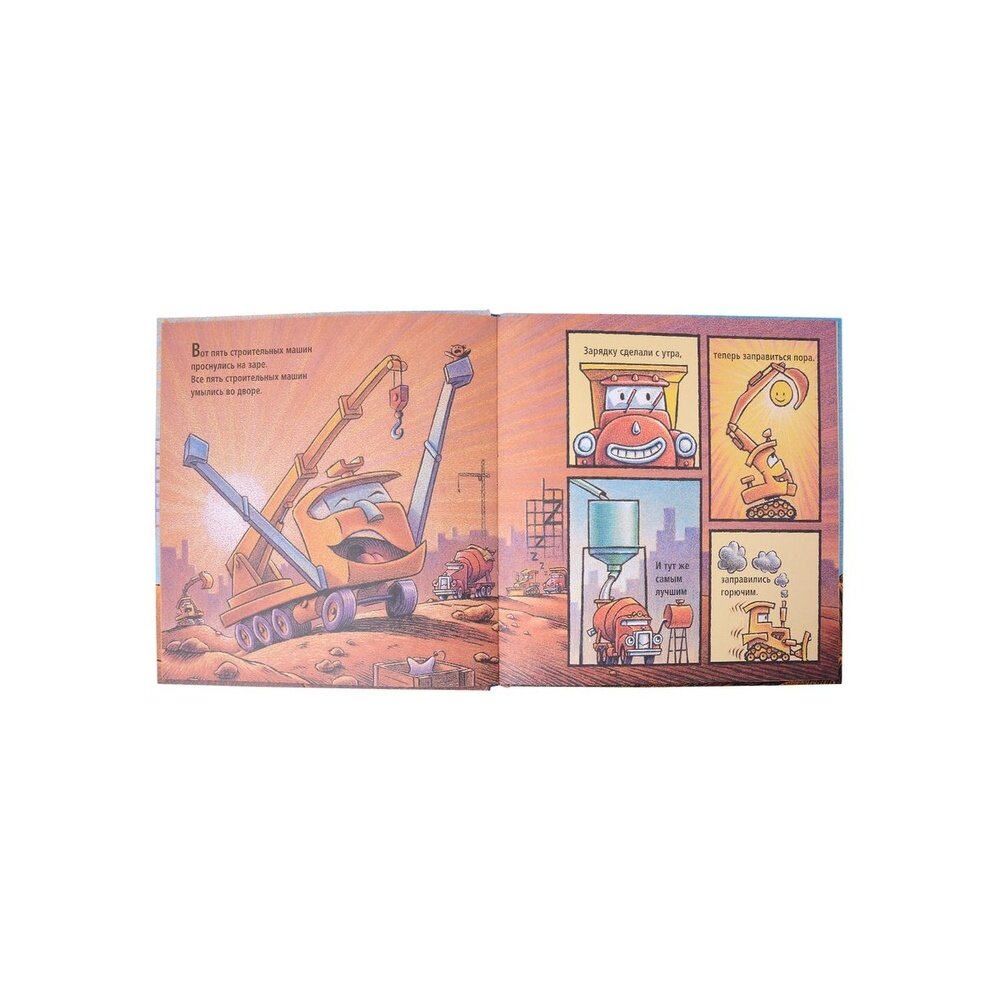 Книгой я очень довольна - она крупная, очень хорошая полиграфия, приятно держать в руках. Ну а самое главное - от нее в восторге мой сын! Он обожает строительную технику, а здесь ее просто в изобилии и с подробным описанием их "рабочего дня". Заканчивается книга ночным отдыхом, что позволяет сделать эту книгу еще и засыпательной, если нет предыдущей книги из этой серии. Смело рекомендую.