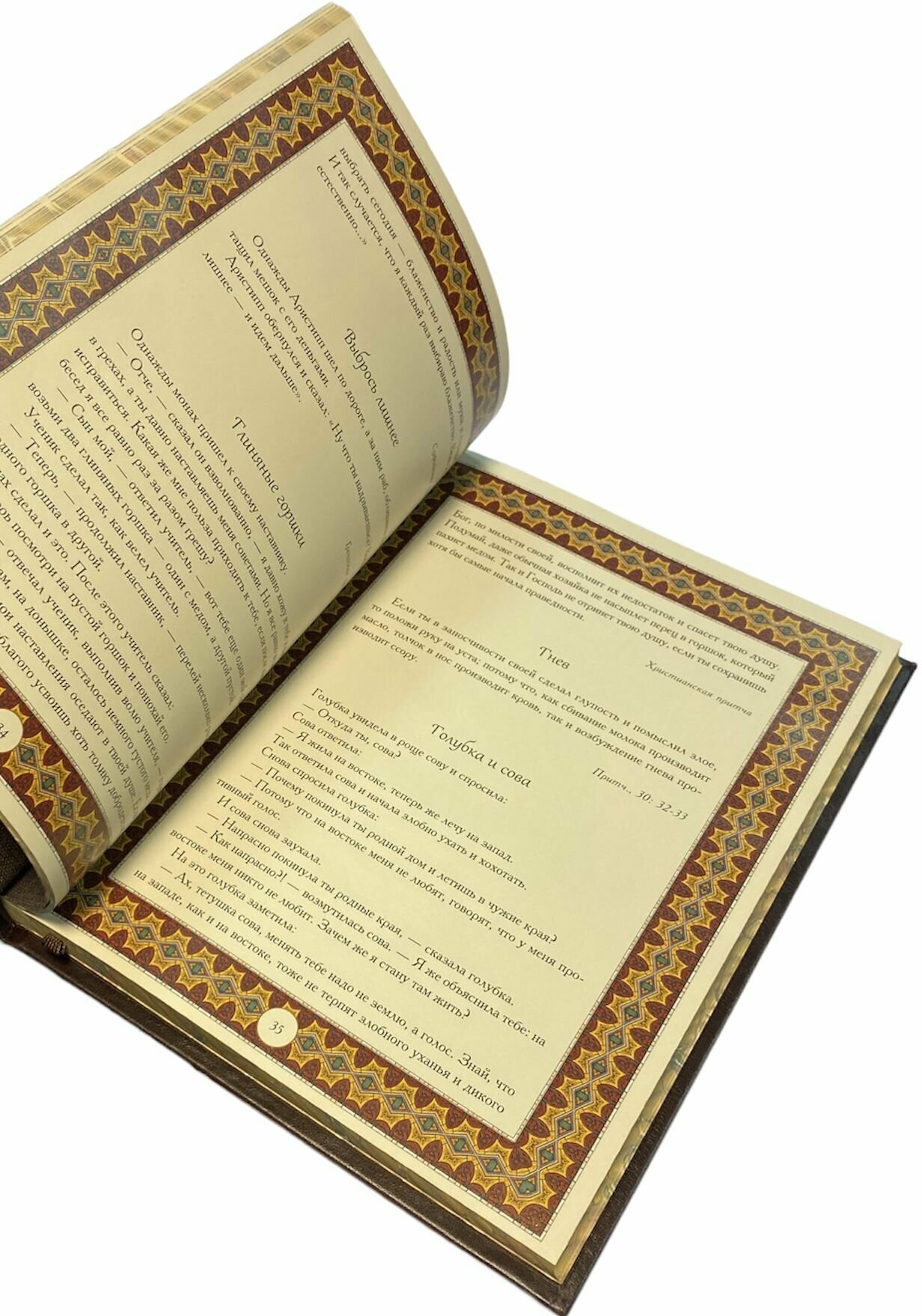 Если у вас есть ребенок или вы понимаете, что не хлебом единым сыт человек, то обязательно купите эту книгу.Объясню почему. 1)Внешне это подарочное издание с пухлой обложкой, прекрасными репродукциями и очень мудрым содержанием. Даже если книга не понравится вам, после аккуратного прочтения можно подарить другу и прослыть мудрым человеком. 2) Думаю книга вам понравится если вы уже обратили на нее внимание. Я читаю ее с 9 летней дочкой, которая из курса начальной школы знает что такое притча, но не сталкивалась с ними в реальности. Было очень забавно смотреть как после первых 2-х прочитанных мною и объясненных мною же притч заскрипели ее мозги, а затем раздался радостный вопль реального осознания всей иносказательности данной литературной формы. Теперь на притчах я увидела такой прирост, не знаю как точнее выразить -"литературной мысли", а главное интерес и желание читать такие" странные рассказы". 3) Поскольку притчи разных народов и разных конфессий, то упоминаются различные известные личности, а также различные религиозные течения и прочтение всего одной притчи может вылиться в исследование на тему: что такое дзен и т.д. Так что читайте, развивайтесь, наслаждайтесь и образовывайтесь!