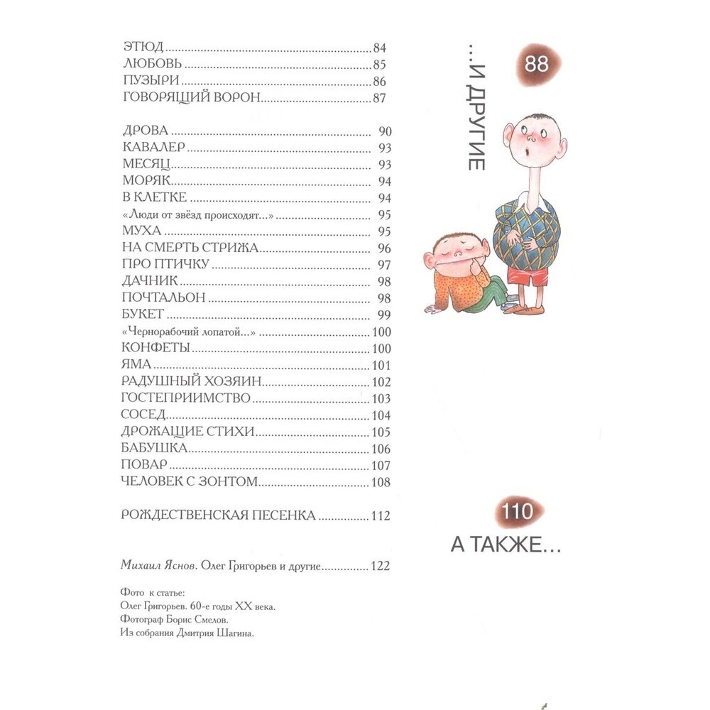 Всем известно, что собственно детских стихов Олег Григорьев не писал. Или почти не писал. И тем не менее Михаилу Яснову, составителю сборника, удалось представить читателю объёмистый том стихов, где все произведения знаменитого ленинградского поэта даны на вырост, от маленького и понятного даже дошкольнику, до почти абстрактного и философского, но всё равно простодушно детского и по смыслу ясного до прозрачности… Целый сборник парадоксов и историй на все случаи жизни: 134 стихотворения, одна "Рождественская песенка" и статья Михаила Яснова о жизни и творчестве поэта.