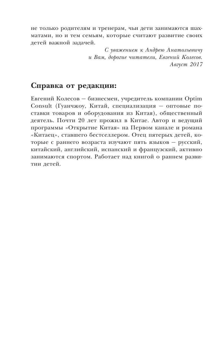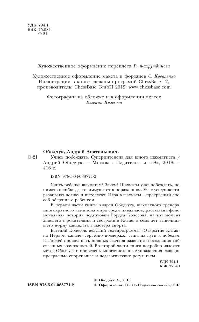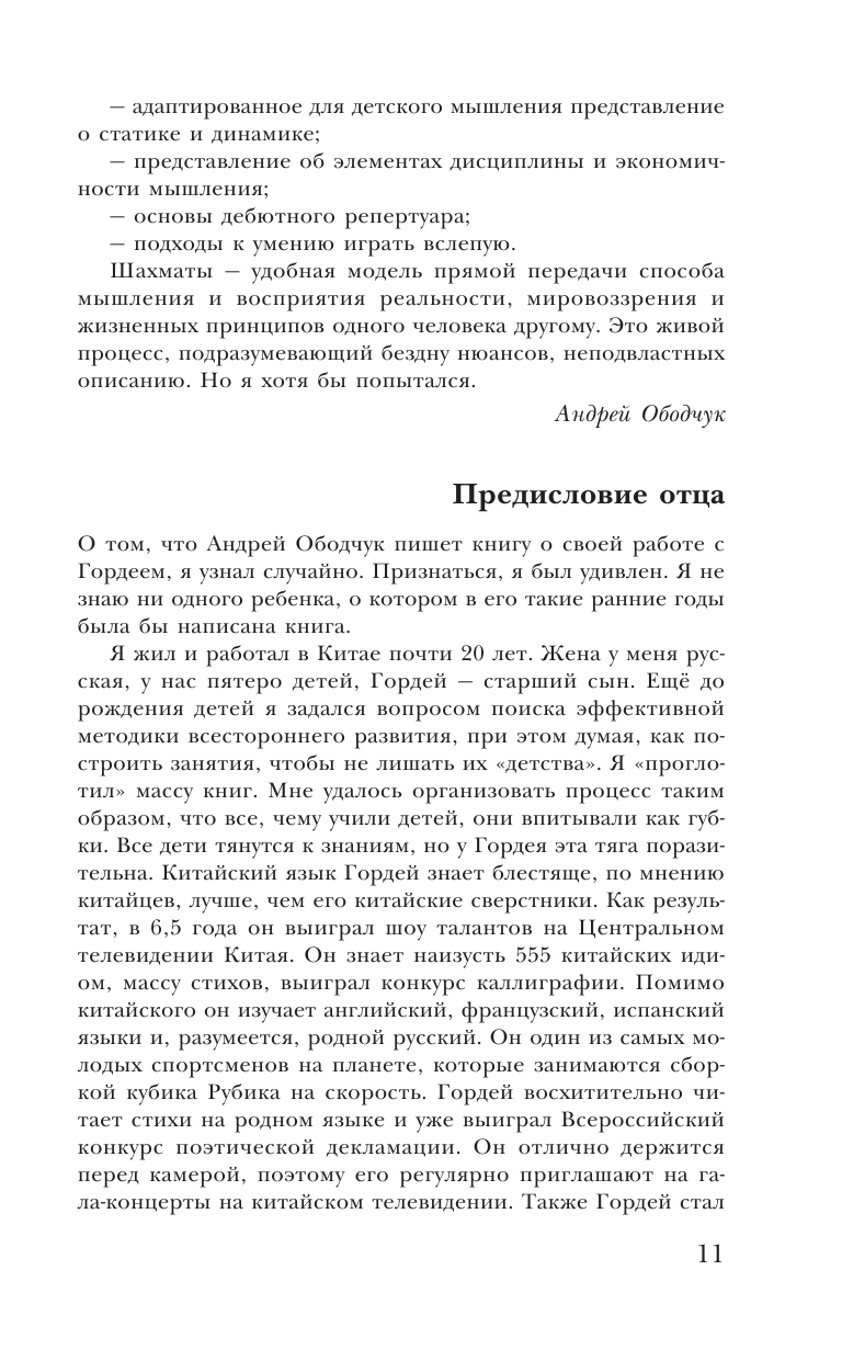 Учить ребенка шахматам? Зачем? Шахматы учат побеждать, понимать ошибки, дают иммунитет к поражениям. Учат усидчивости, развивают логику и интеллект. Игра в шахматы - прекрасный способ общения с ребенком. В первой части книги Андрея Ободчука, шахматного тренера, многократного чемпиона мира среди инвалидов, рассказана феноменальная история подготовки Гордея Колесова, на тот момент жившего с родителями и сёстрами в Китае, в семь лет выполнившего норму кандидата в мастера спорта. Евгений Колесов, ведущий телепрограммы "Открытие Китая" на Первом канале, серьёзно поддержал сына на пути к победам. И Гордей прошел пять мощных скачков развития и осознания собственных возможностей. Во второй части книги подробно изложен метод Ободчука и приведены многочисленные упражнения, дающие прекрасные спортивные и педагогические результаты.