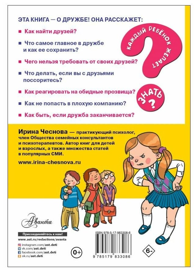 В своей новой книге, обращенной к младшим и средним школьникам, известный семейный психолог Ирина Чеснова раскрывает тему дружбы и общения со сверстниками. Как найти надежных, преданных друзей и отличить настоящую дружбу от ненастоящей? Как знакомиться с теми, кто интересен, и как быть, если на твое предложение о дружбе не откликнулись? Что делать, если вы с друзьями поссорились? Как самому стать хорошим другом и при этом остаться собой - расскажет эта книга.
