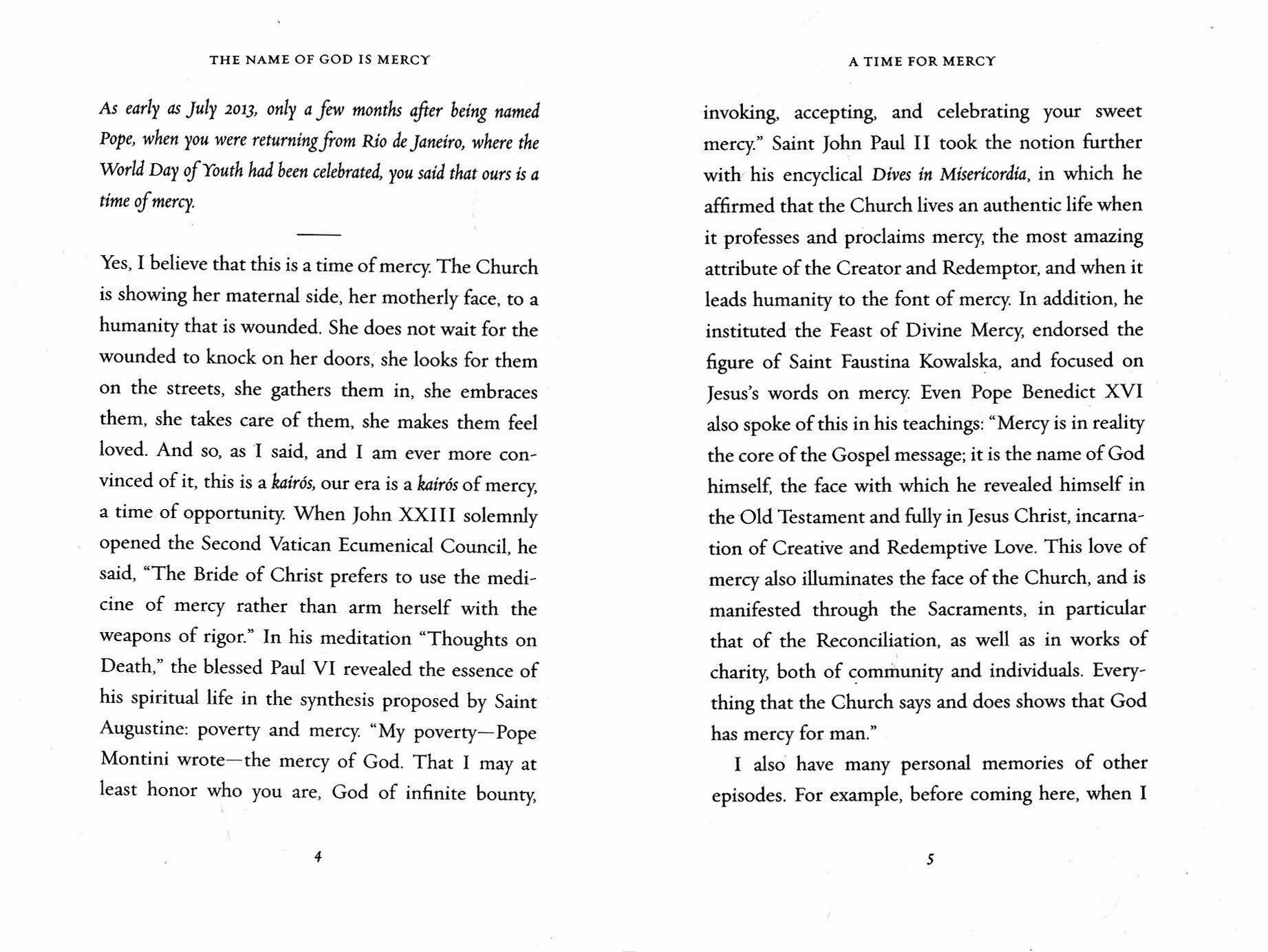 The Name of God is Mercy, Pope Francis' exploration on the universal theme of mercy, is a spiritual inspiration to both followers of Christianity and non-Christians around the world. Drawing on his own experience as a priest and shepherd, Pope Francis discusses mercy, a subject of central importance in his religious teaching and testimony, and in addition sums up other ideas - reconciliation, the closeness of God - that comprise the heart of his papacy. Written in conversation with Vatican expert and La Stampa journalist Andrea Tornielli, The Name of God is Mercy is directed at everyone, inside or outside of the Catholic Church, seeking meaning in life, a road to peace and reconciliation, or the healing of physical or spiritual wounds.