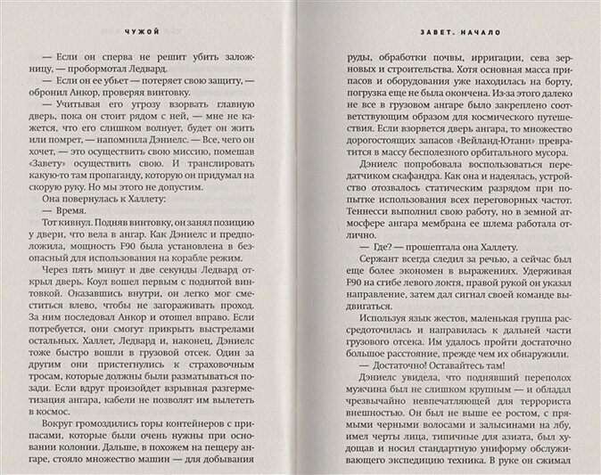 Миссия "Завета" - самое амбициозное мероприятие в истории "Вейланд-Ютани". Корабль, направляющийся к Оригаэ-6 и несущий две тысячи колонистов за пределы известного людям космоса, способен изменить судьбу Корпорации - и будущее всего человечества. Тем не менее есть те, кто готов умереть, лишь бы сорвать миссию. В то время как "Завет" парит на околоземной орбите, несколько случаев насилия вскрывают ужасный заговор, направленный на саботаж запуска. К счастью, пока капитан Джейкоб Бренсон и его жена Дэниелс завершают приготовления к старту, начальник службы безопасности Дэниэл Лопе вербует еще одного, ключевого для своей команды члена экипажа. Вместе они стремятся остановить преступников до того, как звездолет и его пассажиры могут быть уничтожены. Новый роман прославленного Алана Дина Фостера не только раскрывает перед читателями мир, остающийся за спиной отважных колонистов. Это официальная хроника событий, которые привели к происходящему в новейшей главе любимой миллионами киносерии "Чужой".