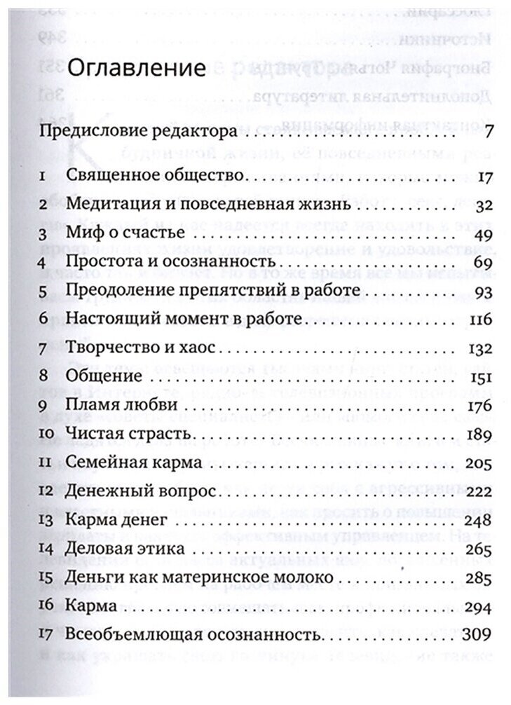 Автор учит читателя разрушать искусственные препятствия, которые мы возводим между нашей духовной практикой и такими извечными составляющими человеческой жизни, как работа, секс и деньги, чтобы увидеть их природную священность, понять то, чему они могут научить нас, и принимать мудрые решения всякий раз, когда мы сталкиваемся с проблемами в нашей повседневной жизни, карьере и личных отношениях.