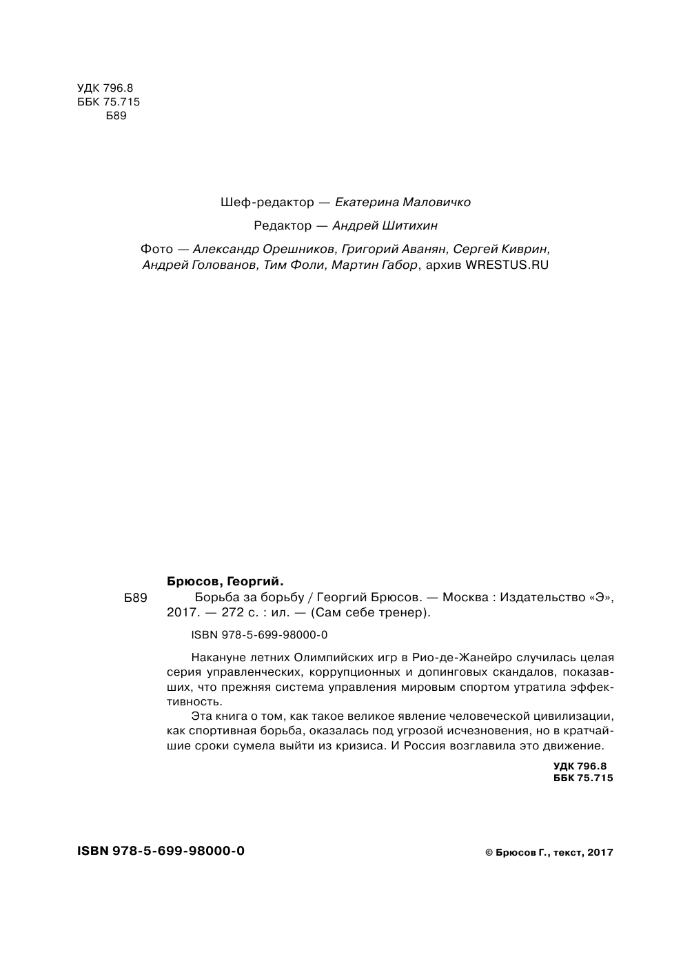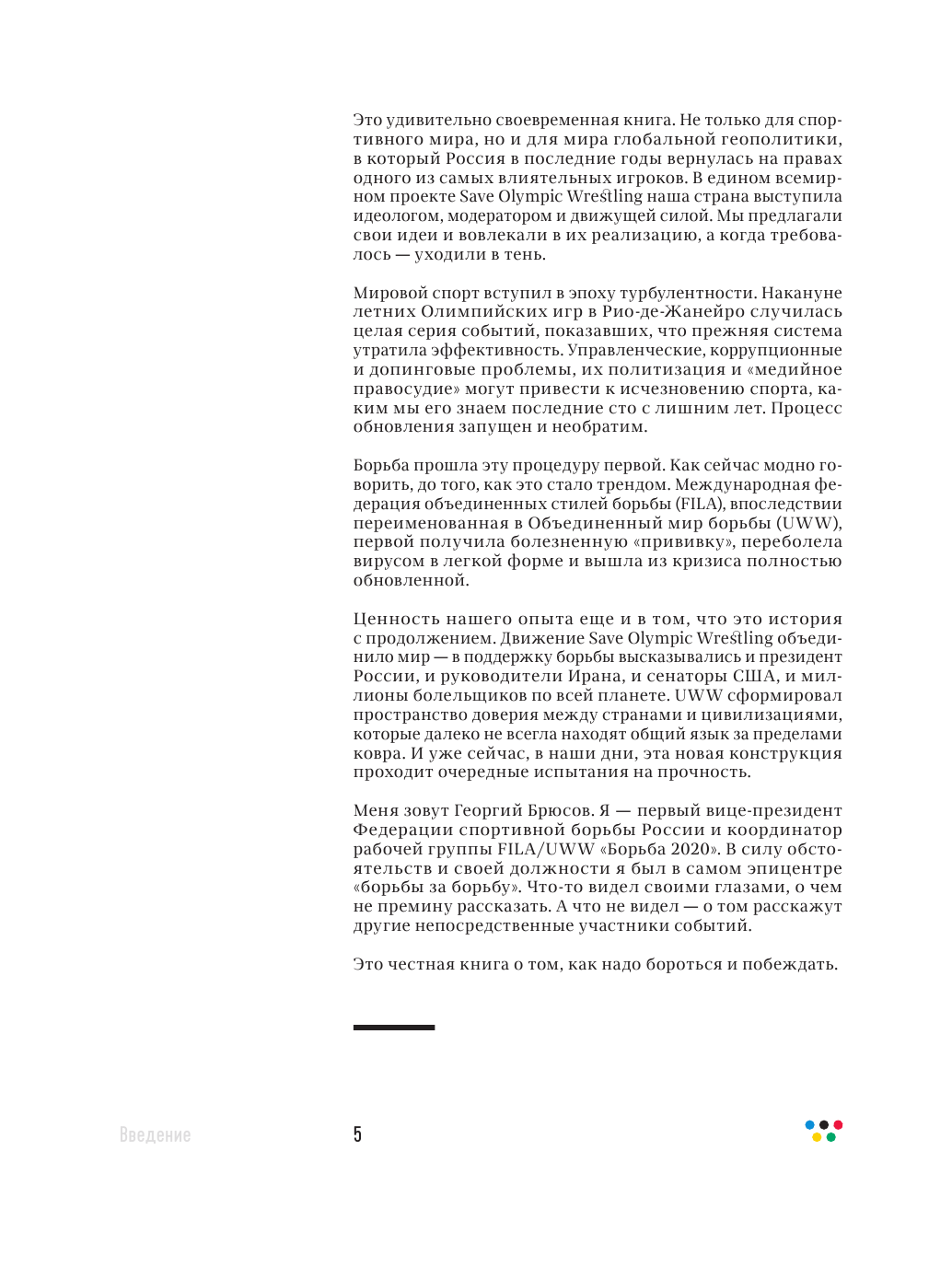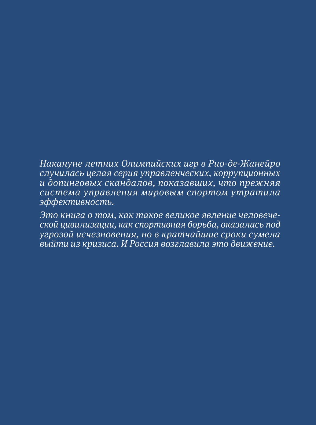 В книге рассказана невероятная история о российском и мировом спорте, собраны эксклюзивные фотографии и комментарии управленцев, спортсменов и олимпийцев, которые принимали живое участие в событиях тех дней. Читатель вместе с авторами проходит весь путь отстаивания борьбы от первого звонка, раздавшегося в кабинете Георгия Брюсова, до полной победы над управленческими, коррупционными и допинговыми интригами.