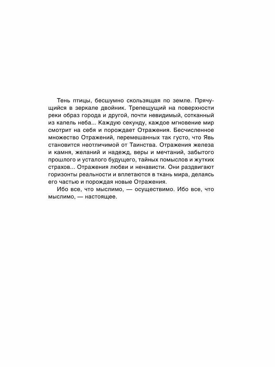 «Отражение» – увлекательный роман в новеллах, расщепляющий привычную реальность на миллиарды невозможных Отражений. Роман-зеркало, в котором смешались музыка и литература, рок и философия, радио и слово, прошлое и будущее. Роман – отражение, сплетающий кошмары и мечты с повседневностью московских улиц и питерских набережных. Роман, в котором НАШ рок звучит с каждой страницы и гитарные рифы летят по строкам. Роман о том, каким мы делаем наш мир, потому что все, что мыслимо, – осуществимо.