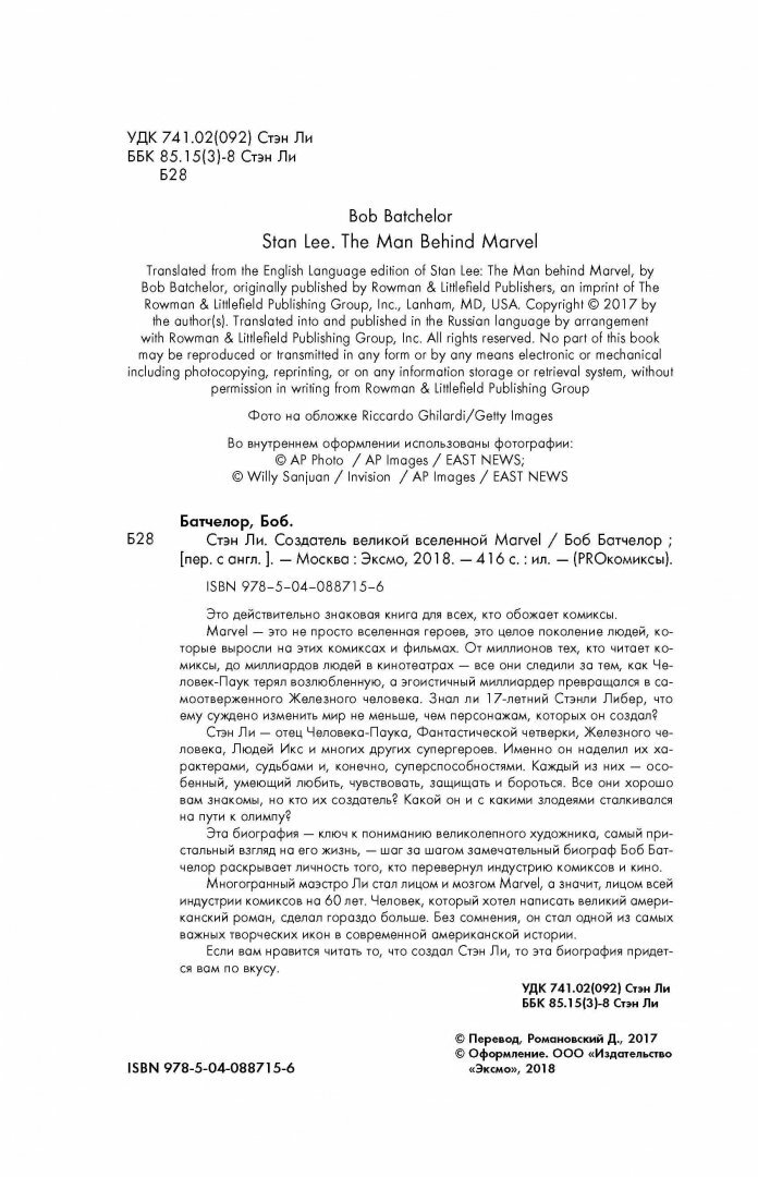 Эта книга можеть стать вашей настольной библией для самого настоящего фаната Marvel. Начнём с автора этой книги. Боб Батчелор - американский историк, эксперт по вопросам культуры, литературы, преподаватель, ассистент кафедры стратегической коммуникации университета Майями. На его счету, редакции, свыше 25 книг художественной американской литературы. Многие эксперты считают его одним из лучших биографов современности. Так что из всех биографий Стэна Ли, именно эта книга является наиболее точной и развернутой. Автор удивительно отразил здесь не один лишь аспект жизни Отца Marvel, Но показал невероятные вещи, что происходили с ним, что он чувствовал и как реагировало общество и менялась культура под действием создания нового героя. Несомненно, чтобы максимально чётко понять героев комиксов, нужно понять их создателя и увидеть их сотворение. А эта Книга Может показать это.