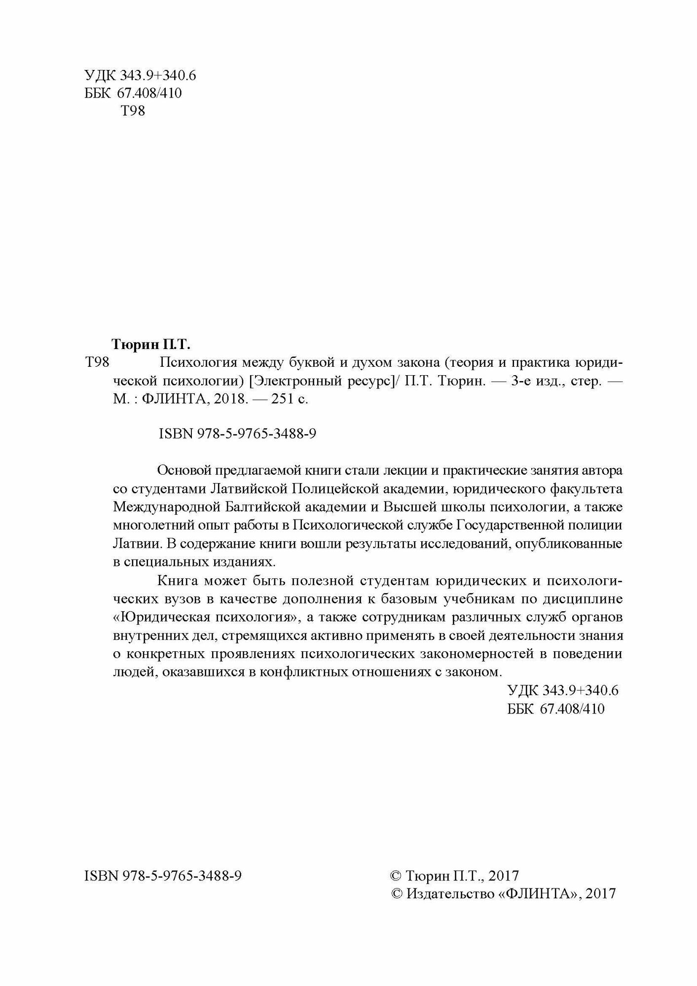 Психология между буквой и духом закона. Теория и практика юридической психологии (Тюрин Павел Трофимивич); Флинта, 2017