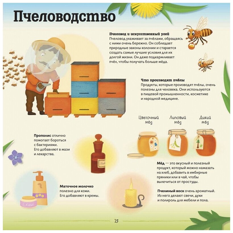 Виды и породы пчёл, продукты их жизнедеятельности, функции рук/ног/глаз — обо всём понемногу. Даже упоминается брачный полёт.