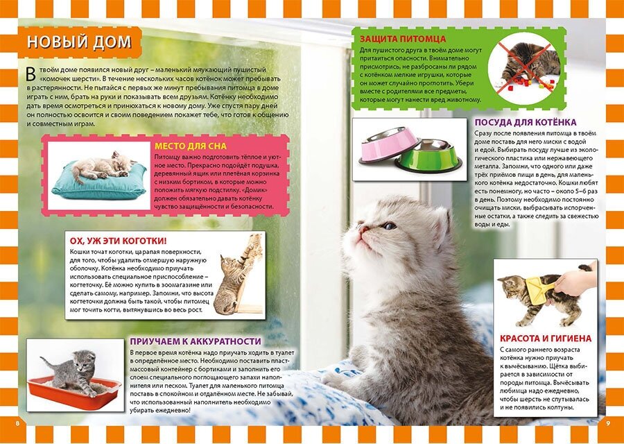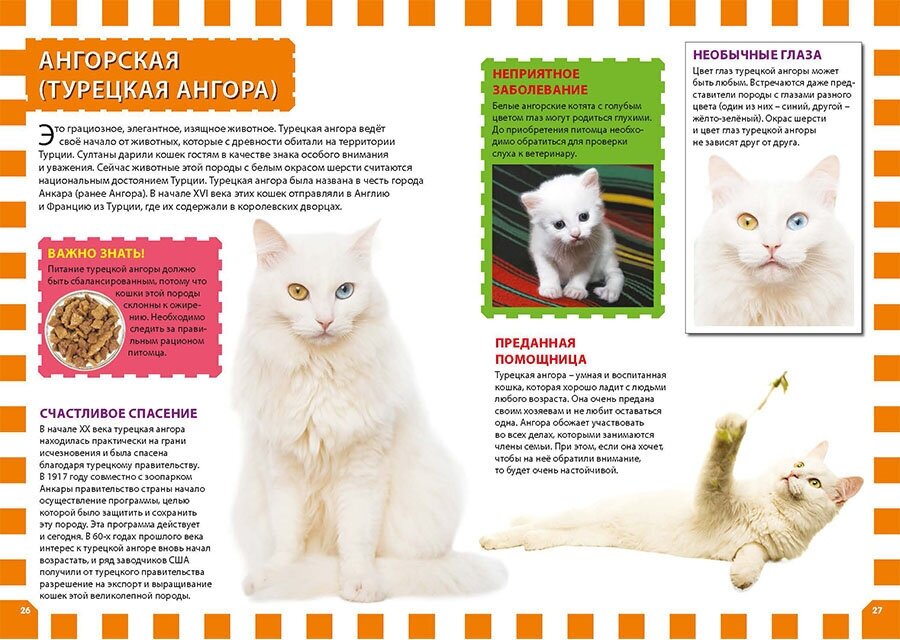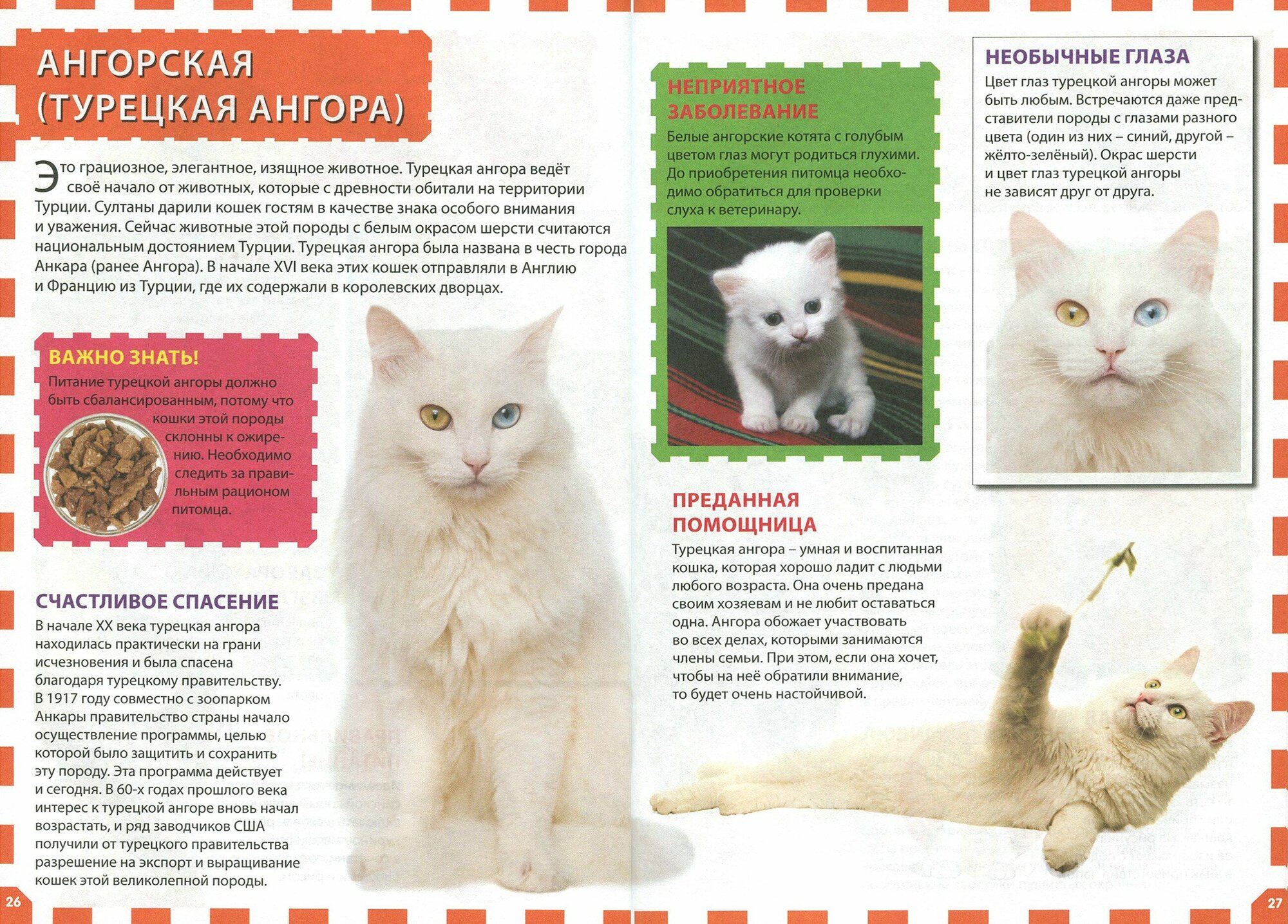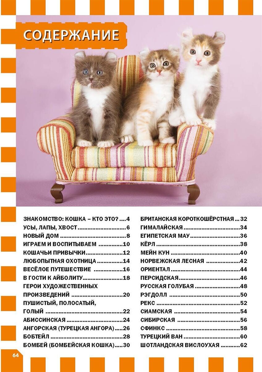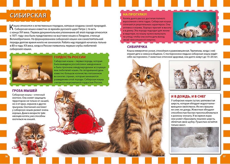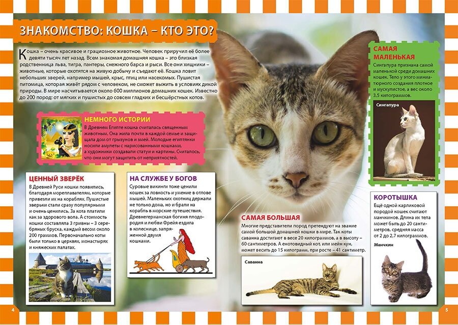 Отличная книга для начала знакомства с кошками. В краткой и доступной форме рассказывается про самих животных, их отличительные черты, привычки. Показаны основные принципы ухода и воспитания кошек. Также приведены примеры различных пород, даны описания внешности, характера, а также советы по питанию и уходу особенные для каждой породы.