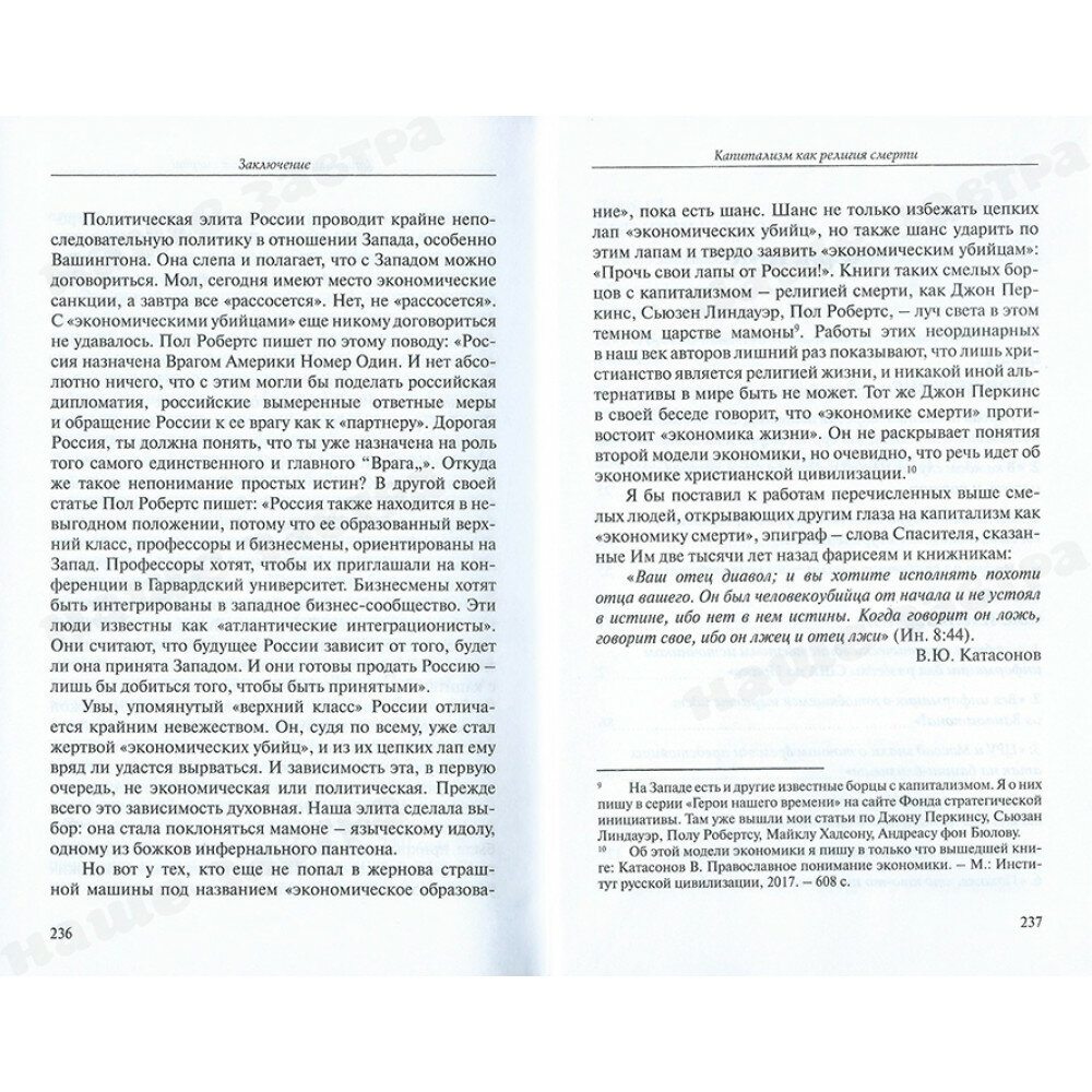 Все они, каждый по-своему, приходят к одним и тем же выводам: "хозяева денег" подчиняют себе не только экономики, но также и жизнь большинства стран и видят себя завтра абсолютными хозяевами мира. Это религиозные фанатики, которые хотят стать человекоподобными "богами". На самом деле это человекоподобные бесы, рассматривающие ложь и убийства главными инструментами своей власти и экспансии. Недаром "герои" книги называют ростовщический капитализм экономикой и религией смерти.
