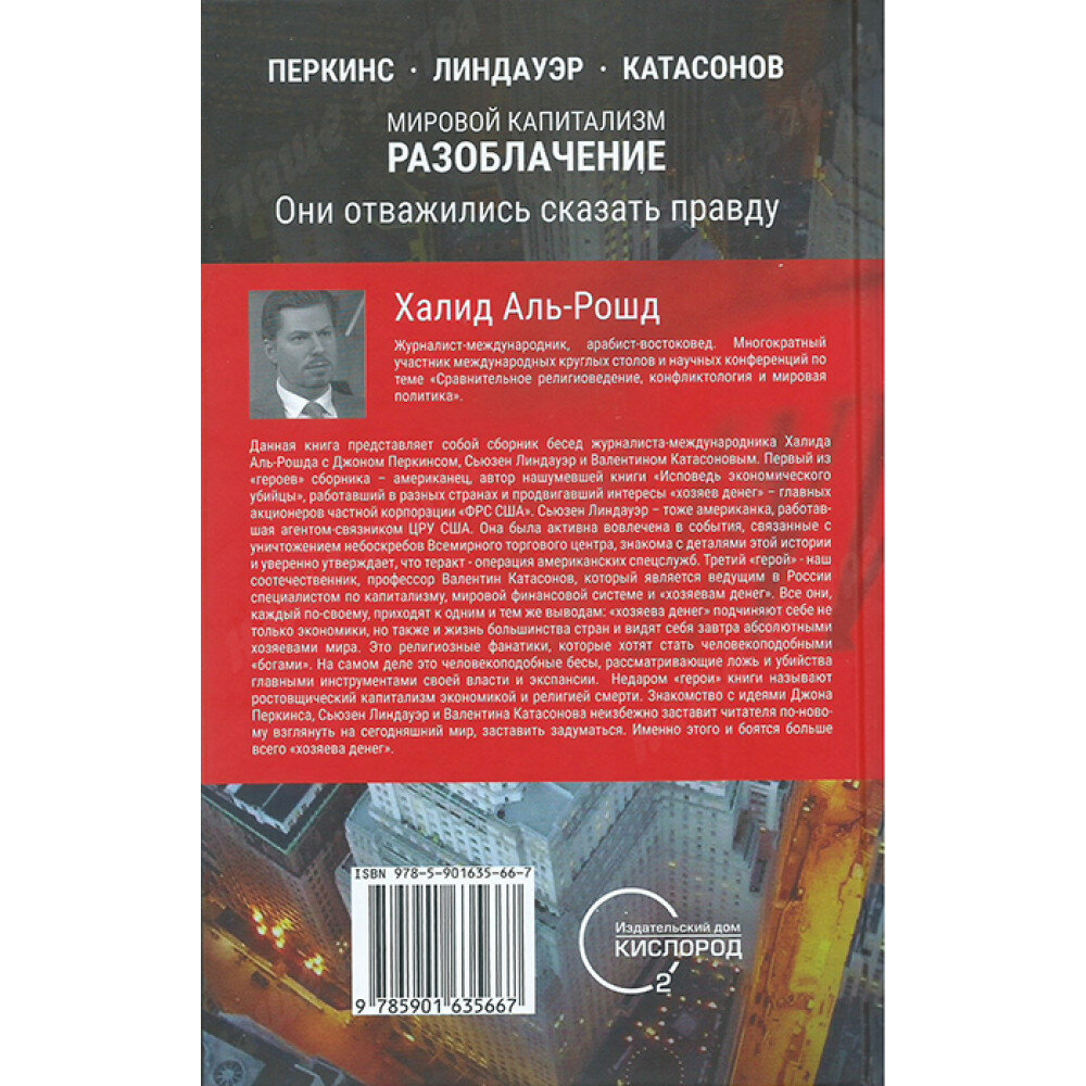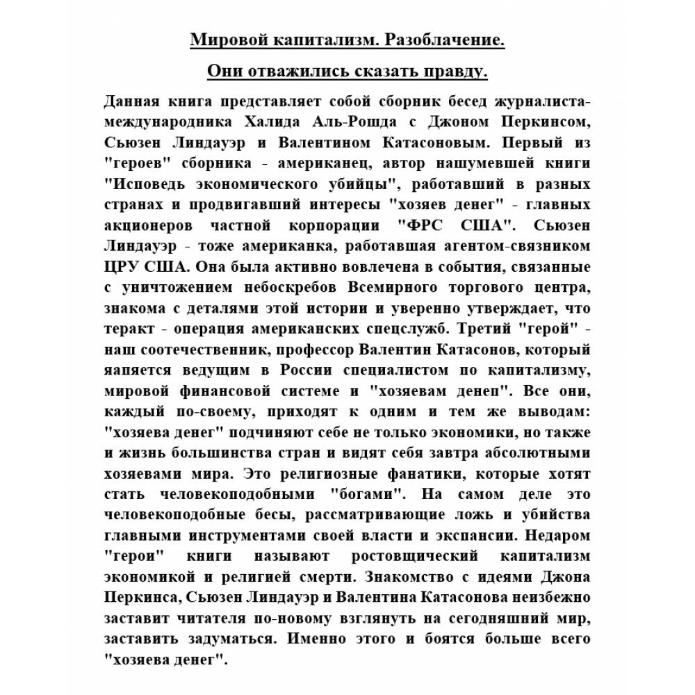 Данная книга представляет собой сборник бесед журналиста-международника Халида Аль-Рошда с Джоном Перкинсом, Сьюзен Линдауэр и Валентином Катасоновым. Первый из "героев" сборника - американец, автор нашумевшей книги "Исповедь экономического убийцы", работавший в разных странах и продвигавший интересы "хозяев денег" - главных акционеров частной корпорации "ФРС США". Сьюзен Линдауэр - тоже американка, работавшая агентом-связником ЦРУ США. Она была активно вовлечена в события, связанные с уничтожением небоскребов Всемирного торгового центра, знакома с деталями этой истории и уверенно утверждает, что теракт - операция американских спецслужб. Третий "герой" - наш соотечественник, профессор Валентин Катасонов, который является ведущим в России специалистом по капитализму, мировой финансовой системе и "хозяевам денег".
