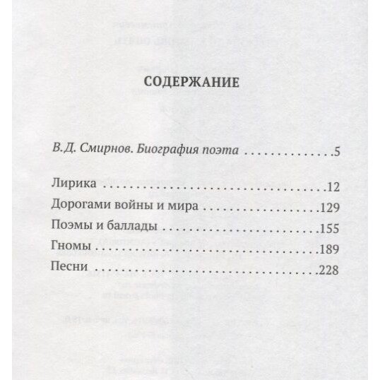 Сборник стихов советского поэта Дмитрия Артемьевича Смирнова (1917-1993) включает его лучшие произведения, созданные в 1940-е-1980-е годы: любовную и гражданскую лирику, стихи о природе, о судьбах современников, поэмы и баллады, краткие стихи-афоризмы. В творчестве писателя, прошедшего Великую Отечественную войну, отразились и его фронтовые переживания и воспоминания. В книгу вошли также тексты эстрадных песен на слова Д. А. Смирнова, исполнявшихся популярными певцами (М. Кри-сталинской, Т. Гвердцители, О. Воронец, Е. Шавриной, Л. Мондрус, В. Трошиным, И. Кобзоном и др.).