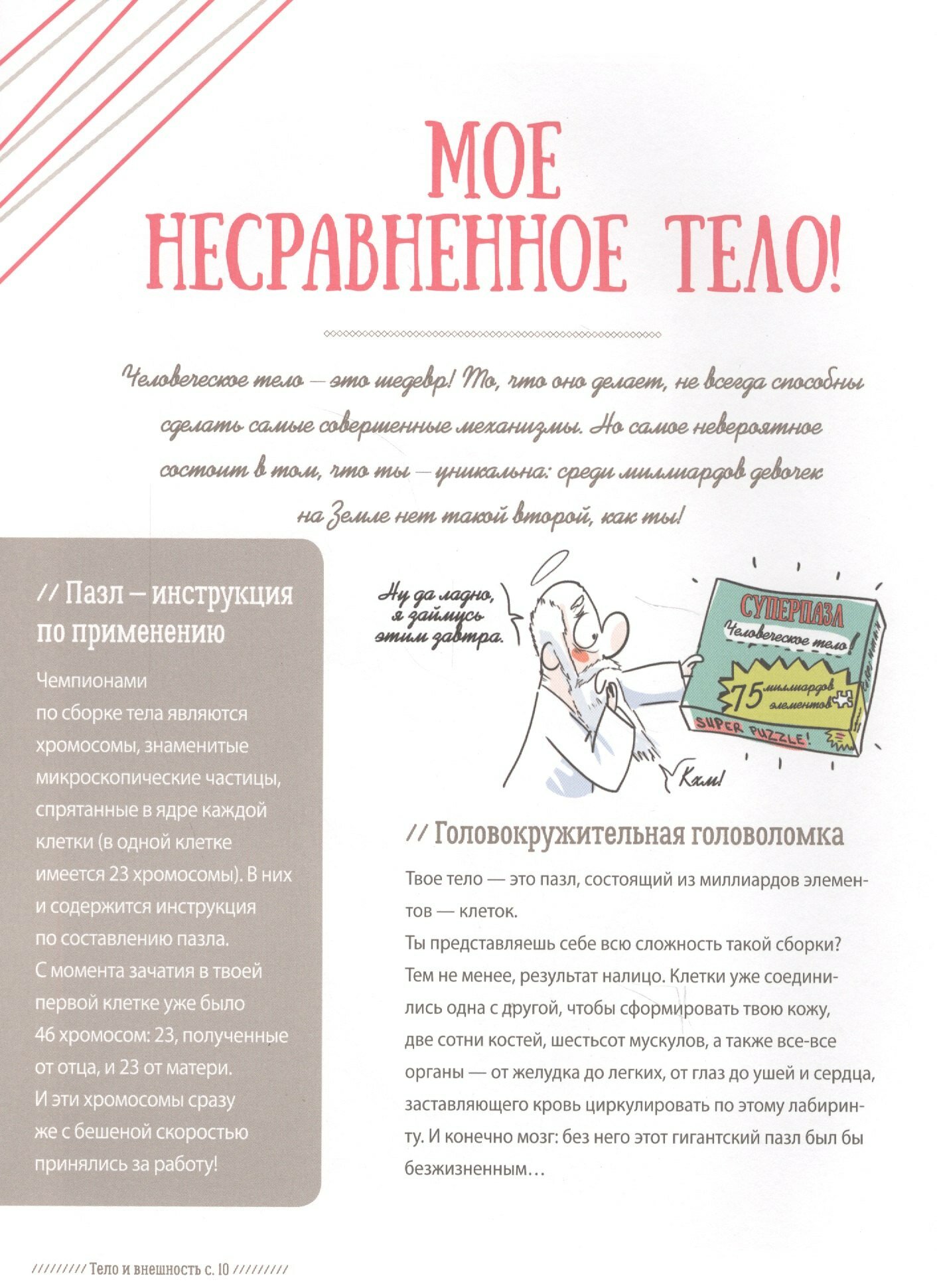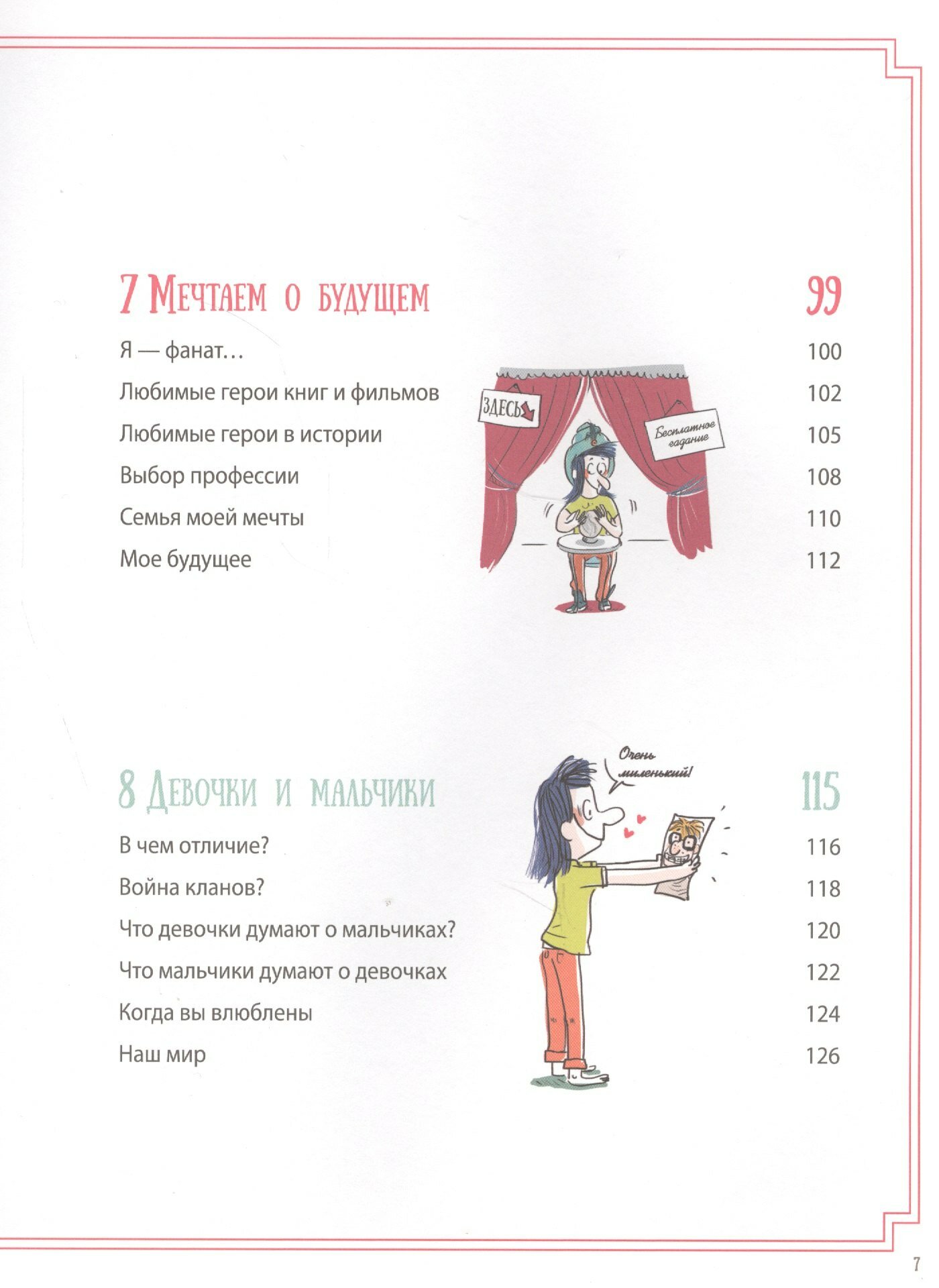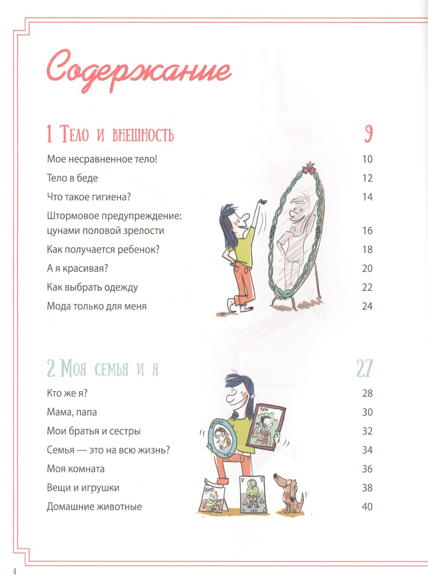 Книгу покупала для своей девятилетней дочери. Затронуты почти все темы важные на этапе взросления. Мне важно, чтобы было про физиологические изменения происходящие с девочкой в период переходного возраста, и здесь это есть, и написано очень корректно, без лишней детализации этих моментов. Как раз для 9-10 лет. Иллюстрации и забавные подписи к ним очень оживляют книгу.