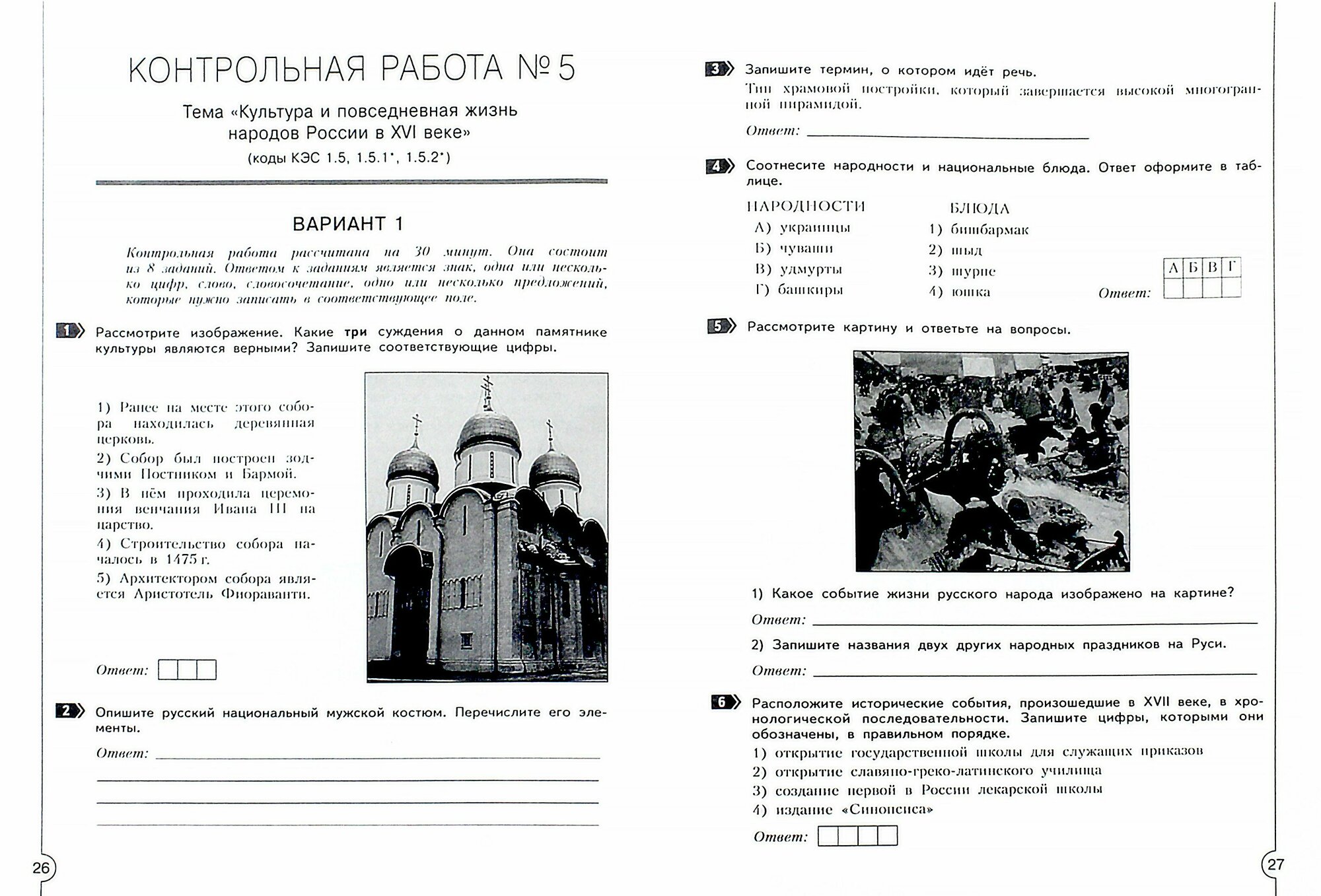 Материалы тетради позволяют проверить знания школьников по основным темам курса, а также проводить итоговый контроль. Контрольные тестовые работы представлены в двух вариантах. Все задания разработаны на основе контролируемых элементов содержания, определенных кодификатором ФИПИ по предмету "История". В каждой работе (коды КЭС представлены в их начале) проверяется материал нескольких параграфов учебника.