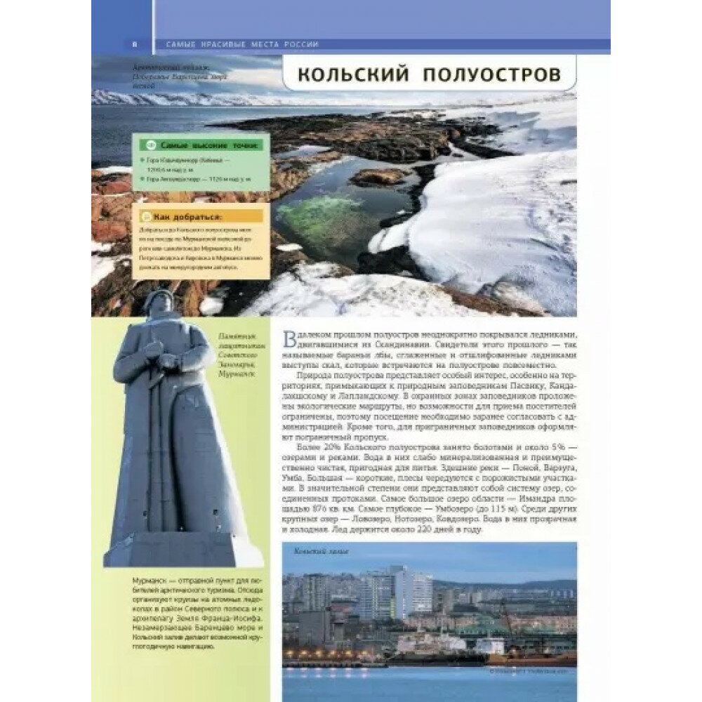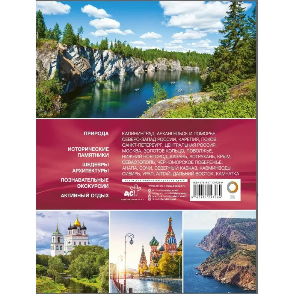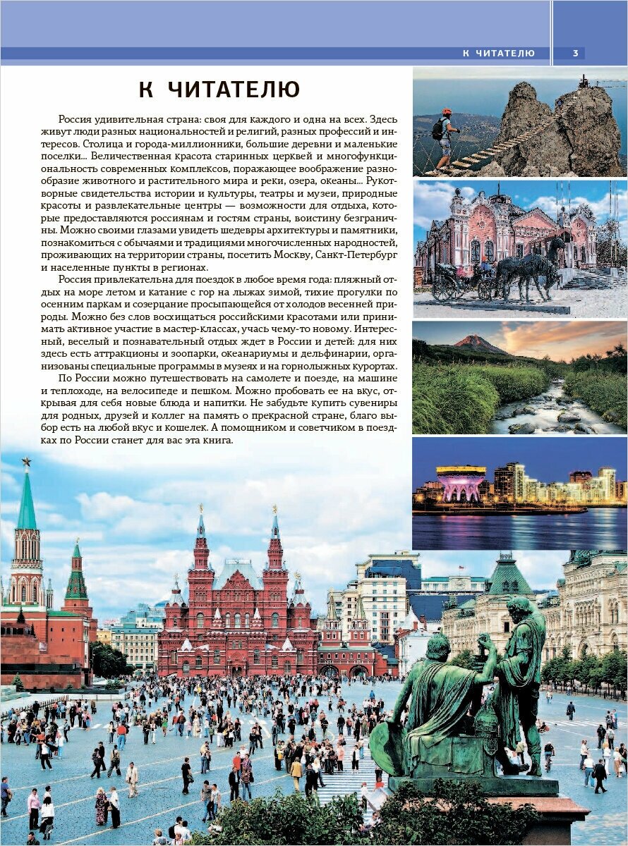 Эта книга своеобразный прекрасно иллюстрированный путеводитель по всей огромной территории России - от Балтии до Дальнего Востока. Она представляет самые известные и наиболее посещаемые туристами места нашей страны, знаменитые культурно-исторические памятники, архитектурные шедевры, красоты природы и другие достопримечательности. Читатель найдет в книге не только яркие иллюстрации и увлекательные статьи об уникальных уголках нашей родины, но и подробную информацию, карты, справочные материалы, которые позволят подготовиться к путешествию (сориентироваться в том, когда лучше всего планировать поездку, что обязательно стоит посмотреть, как лучше всего добраться до того или иного места и т. п.). Книга будет интересна и полезна не только тем, кто отправляется путешествовать, но и тем, кто любит путешествовать виртуально, погружаясь в познавательный рассказ или выразительные фотографии