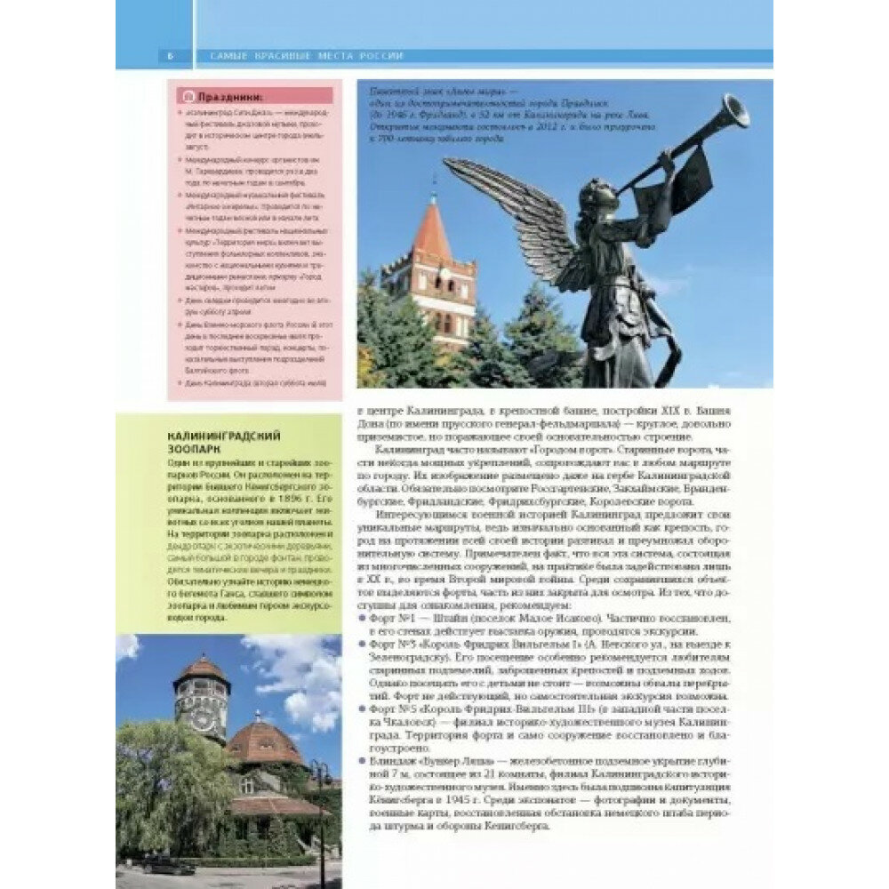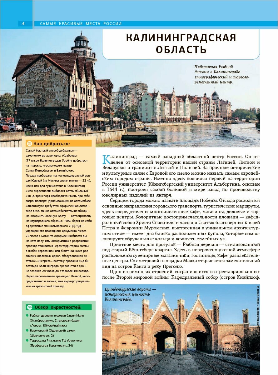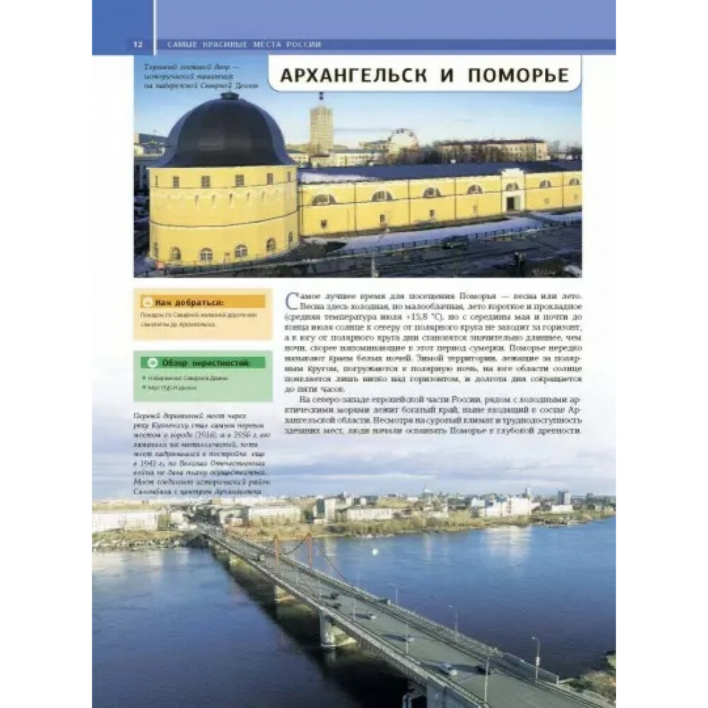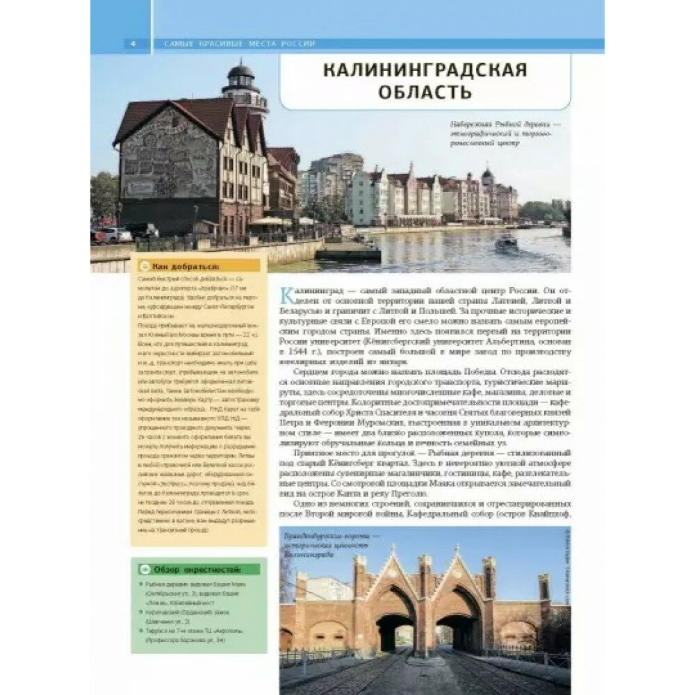 Эта книга своеобразный прекрасно иллюстрированный путеводитель по всей огромной территории России - от Балтии до Дальнего Востока. Она представляет самые известные и наиболее посещаемые туристами места нашей страны, знаменитые культурно-исторические памятники, архитектурные шедевры, красоты природы и другие достопримечательности. Читатель найдет в книге не только яркие иллюстрации и увлекательные статьи об уникальных уголках нашей родины, но и подробную информацию, карты, справочные материалы, которые позволят подготовиться к путешествию (сориентироваться в том, когда лучше всего планировать поездку, что обязательно стоит посмотреть, как лучше всего добраться до того или иного места и т. п.). Книга будет интересна и полезна не только тем, кто отправляется путешествовать, но и тем, кто любит путешествовать виртуально, погружаясь в познавательный рассказ или выразительные фотографии