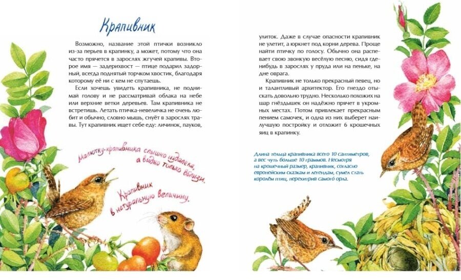 Книжка из серии познаем мир и природу. Не все из нас могут похвастаться отличным знанием птиц, а уж безошибочно ответить, кто из птичек самый маленький или, где обитает пингвин - эльф, думаю, под силу единицам ! Эта книжка поможет восполнить наши пробелы в знаниях и научит наших деток с малых лет интересоваться природой и познавать интересный мир крошечных птичек. В книжке очень милые, яркие рисунки, многие птички специально нарисованы в своем реальном размере, чтобы нам было легче представить, какие-же они крошечные. Книжечку советую к приобретению всем тем, чьи детки интересуются природой и любят узнавать много нового и необычного.
