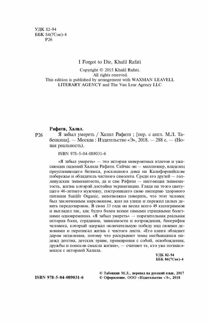 "Я забыл умереть" - это история невероятных взлетов и ужасающих падений Халила Рафати. Сейчас он - миллионер, владелец преуспевающего бизнеса, роскошного дома на Калифорнийском побережье и обладатель частного самолета. Среди его друзей - голливудские знаменитости, да и сам Рафати - настоящая знаменитость, жизнь которой достойна экранизации. Глядя на этого цветущего 46-летнего мужчину, построившего свою империю здорового питания Sunlife Organic, невозможно поверить, что этот человек был законченным наркоманом, жил на улице и пережил целых девять передозировок. В свои 33 года он весил всего 49 килограммов и выглядел так, как будто болен всеми самыми страшными болезнями одновременно. "Я забыл умереть" - поразительная реальная история боли, страдания, зависимости и возрождения, биография человека, который одержал окончательную победу над своими демонами и переписал жизнь с чистого листа. "Его книга обладает даром исцеления, потому что раскрывает темы несбывшихся надежд детства, детских травм, примирения с собой, освобождения, дружбы и поисков смысла жизни", - считают те, кто уже познакомился с историей Халила.