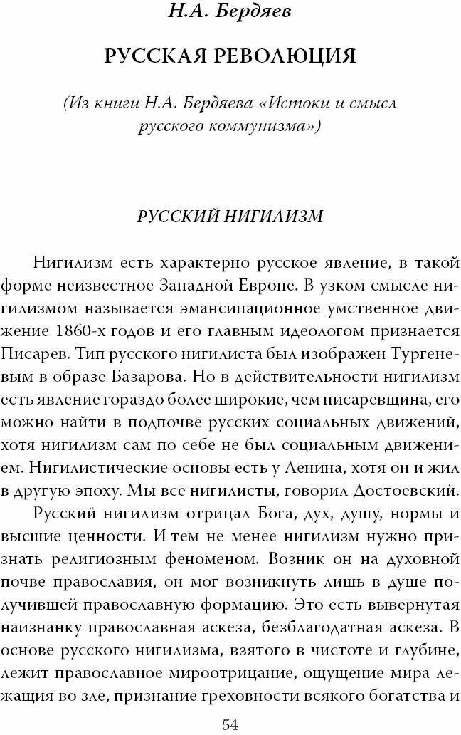 Книга представляет собой своеобразную подборку статей философов. Можно сказать, содержание разделено на 3 части. В первой (она называется "Россия и русские") представлены некоторые статьи Бердяева о русской душе, о мессианском сознании, о русском империализме. Вторая - состоит из статей того же философа и носит название "Русская революция". Здесь раскрываются взгляды Бердяева на нигилизм, анархизм, марксизм, большевизм и сталинизм. В третью же часть вошли выборочные статьи Лосского из книги "Характер русского народа".
